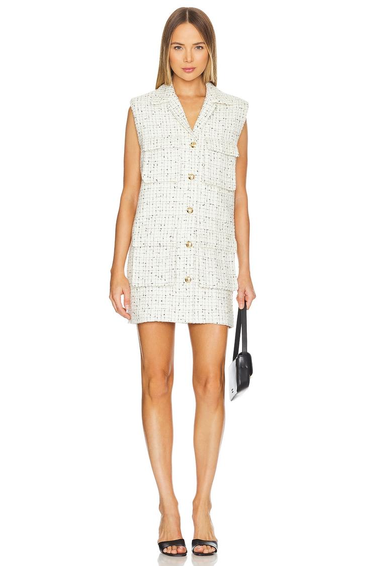 A textured white shift dress featuring a clean mini hem and sleeveless V-neck silhouette perfect for transitional autumn and winter wardrobes. The fully lined wool-blend fabric adds warmth and structure, complemented by a front button closure with gold-tone buttons that bring a sophisticated touch. Its regular fit and classic style make it versatile for brunch, date nights, business casual settings, and cocktail events. This chic dress balances timeless elegance with contemporary polish for effortless style in cooler seasons.