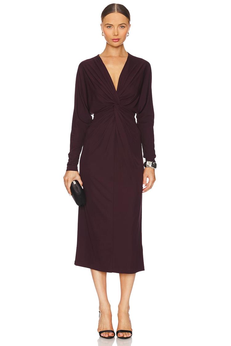 Luxurious heavyweight slinky jersey fabric shapes a fitted sheath silhouette with a flattering front knot accent and elegant draping detail. This midi-length dress features a deep V-neckline and long regular sleeves, perfect for cooler seasons. The matte burgundy hue enhances its sophisticated and modern appeal, making it an excellent choice for cocktail events, date nights, or semi-formal occasions. Designed for a pull-on fit with slip-on styling and unlined comfort, it blends ease and elegance seamlessly for refined autumn and winter wardrobes.