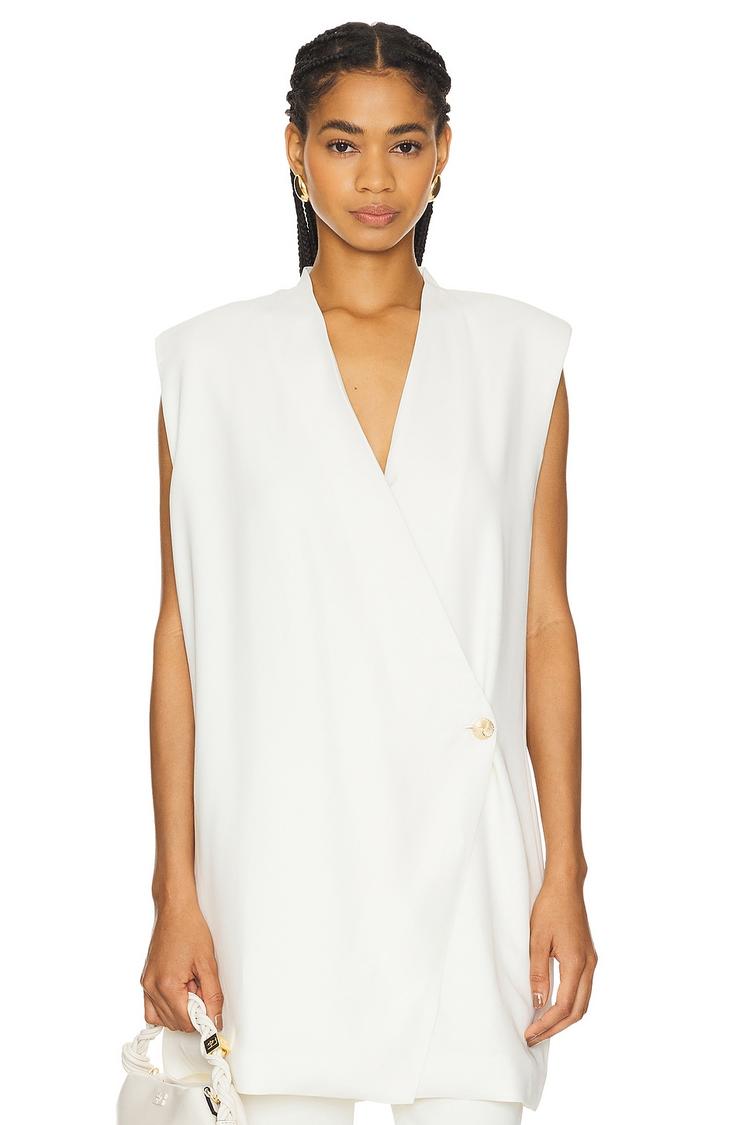Clean lines and a minimalist vibe define this thigh-length wrap dress in crisp white. Crafted from lightweight suiting fabric with a blend of viscose, elastane, and polyester, it features padded shoulders and a single button closure for a modern, sophisticated silhouette. The sleeveless cut and V-neck enhance its sleek profile, making it a versatile choice for business casual, conferences, and workwear settings. Elevate your professional wardrobe with this chic piece that balances comfort and style effortlessly.