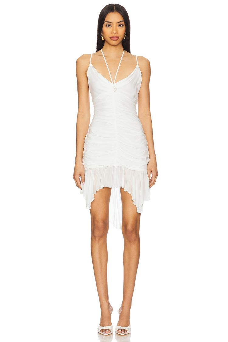 Soft viscose fabric and a bodycon silhouette define this mini slip dress with a plunging V-neckline and delicate spaghetti straps. The ruched seams enhance the fitted shape, while ruffled asymmetric hem adds a flirty touch. Featuring a hidden back zipper and a halter tie-back closure, this dress also includes bead embellishments at the neckline for subtle sparkle. Its semi-sheer texture lends a sensual vibe perfect for spring and summer evenings. Ideal for cocktail parties, date nights, or a night out, this elegant piece combines sexy details with sophisticated style.