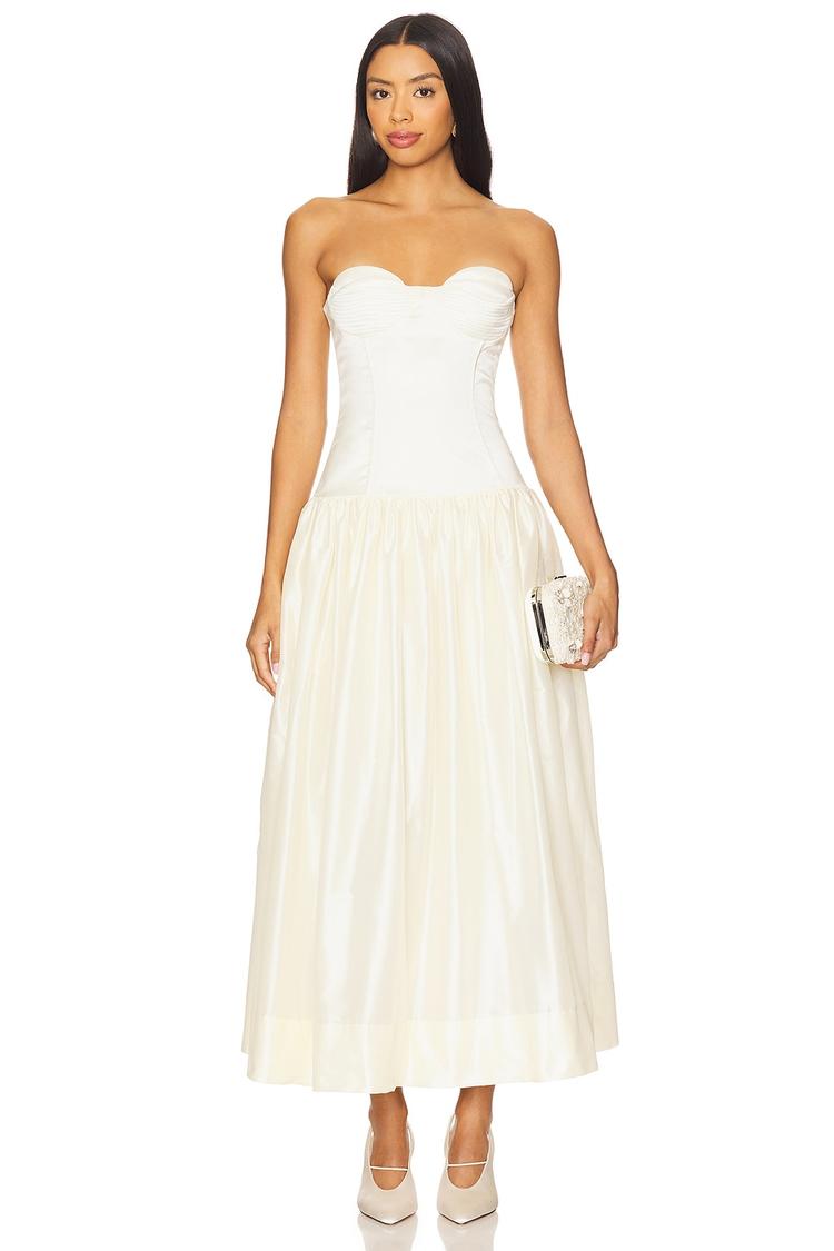 A fitted corset dress with a sweetheart neckline and boned bodice crafted in midweight satin polyester. The midi-length cream gown features a clean hemline and hidden back zipper for a seamless finish. Side seam pockets add a practical touch to its elegant silhouette. Ideal for formal events, cocktail parties, or wedding guest attire during spring to autumn, this sophisticated gown combines classic styling with contemporary details for a timeless look.