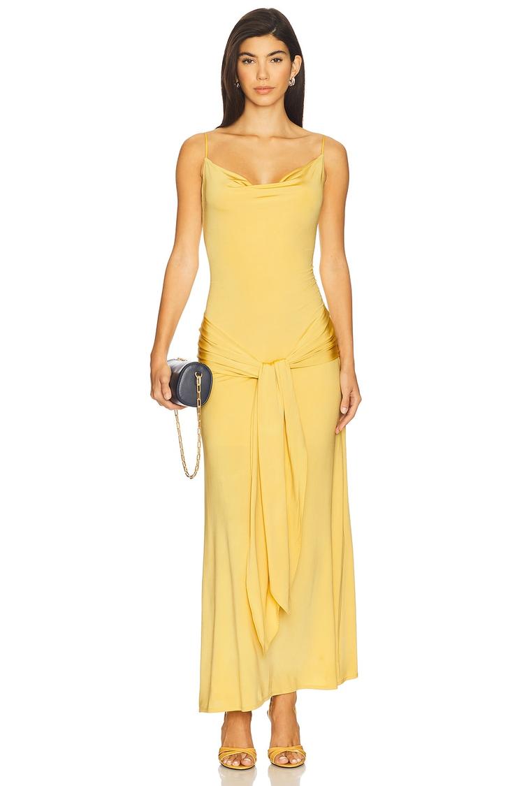 Soft, matte yellow viscose jersey with a hint of elastane sculpts a slim, maxi slip dress featuring a graceful cowl neck and delicate spaghetti straps. The sleek silhouette is enhanced by elegant front and back draping, creating a timeless, minimalist look perfect for cocktail evenings, date nights, or stylish night outs. This pull-on gown combines comfort with sophistication, ideal for warm spring and summer occasions.