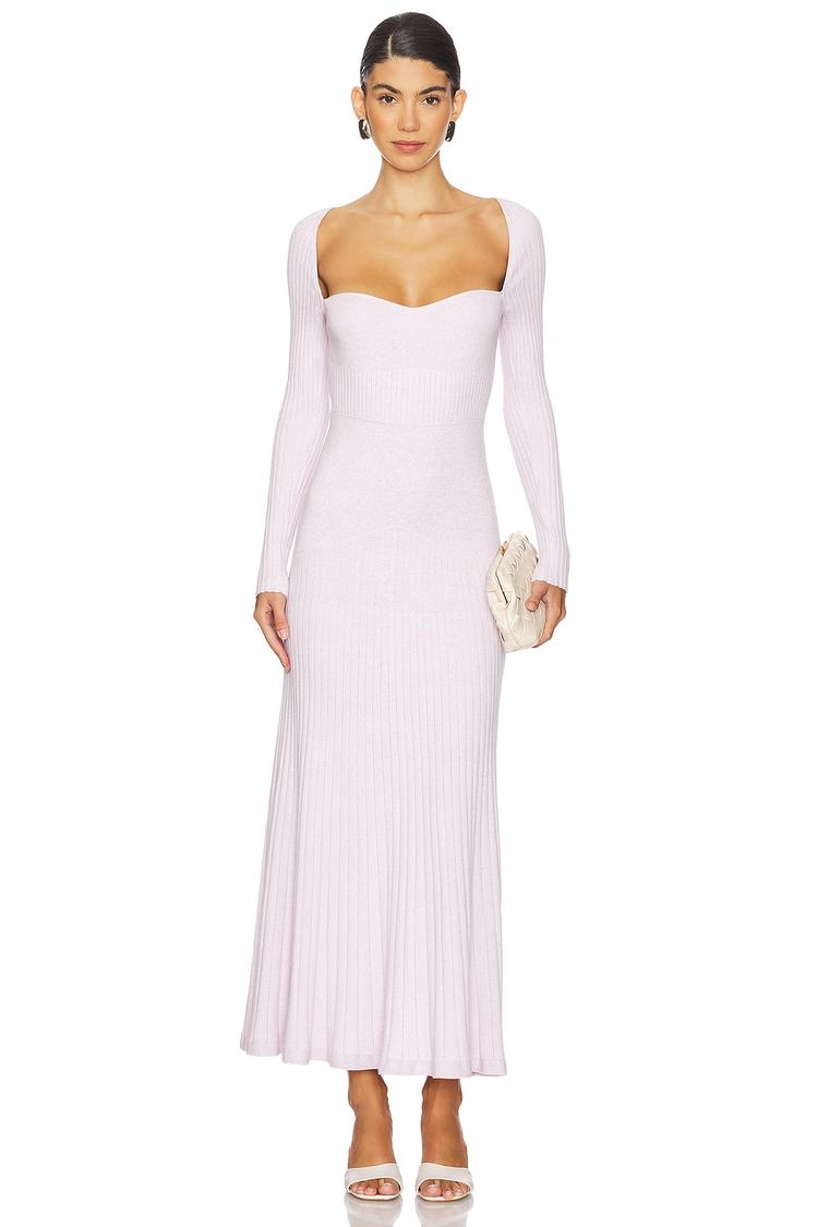 Softly sculpted with a sweetheart neckline and long sleeves, this fitted midi sheath dress in a light pink matte knit fabric offers an elegant and minimalist silhouette. The slinky knit textile provides subtle stretch and a sleek drape, enhancing its sophisticated appeal. Perfect for cocktail evenings, formal events, or romantic date nights, this slip-on style delivers both comfort and refined style. Its clean hemline and covered back complete a timeless look that transitions beautifully across seasons.