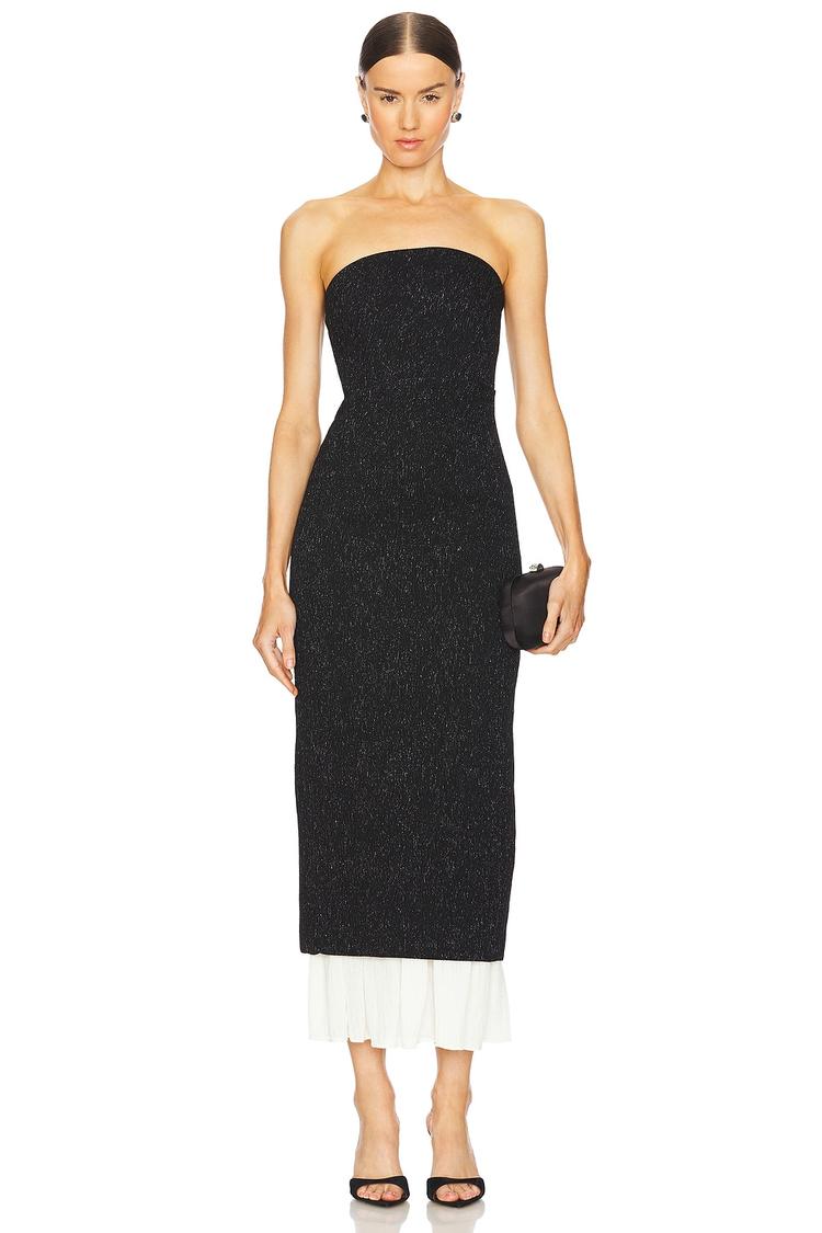 A sleek sheath silhouette in matte black twill fabric is elevated with subtle metallic threading and a boned strapless bodice for a perfect fitted look. The midi length with a clean hem and an off-white contrast underlayer adds a modern twist, while the hidden back zipper and back vent ensure comfort and ease. Ideal for cocktail parties, semi-formal events, and date nights, this elegant dress combines sophisticated style with a touch of shimmer from metallic details, making it a standout choice for versatile evening wear.