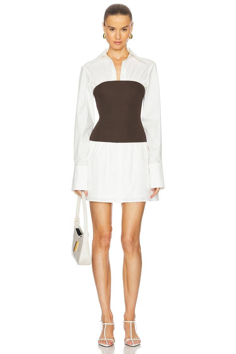 Clean lines and a crisp white poplin fabric combine with a fitted rib jersey bodice in dark brown to create a striking shirt dress. The mini length and long cuffed sleeves balance modern tailoring with classic style, featuring a collar neckline and partial front button closure. Its versatile design is perfect for business casual settings, workwear, and stylish brunches in spring or autumn. Crafted from a cotton-nylon-spandex blend with polyester lining, this dress offers both comfort and structure for a polished everyday look.