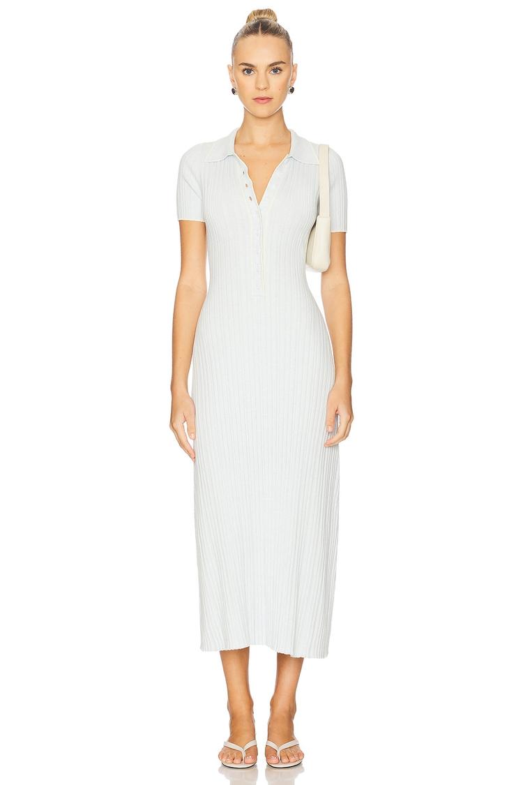 Softly ribbed heavyweight knit fabric sculpts a fitted sheath silhouette in this midi-length dress. The V-neckline with a front partial button closure adds subtle detail, while half sleeves and a clean hemline offer timeless minimalism. Its semi-sheer quality lends a delicate allure, perfect for casual outings, brunch dates, or refined workwear looks. This versatile piece transitions effortlessly across seasons, embracing a classic style with modern comfort.