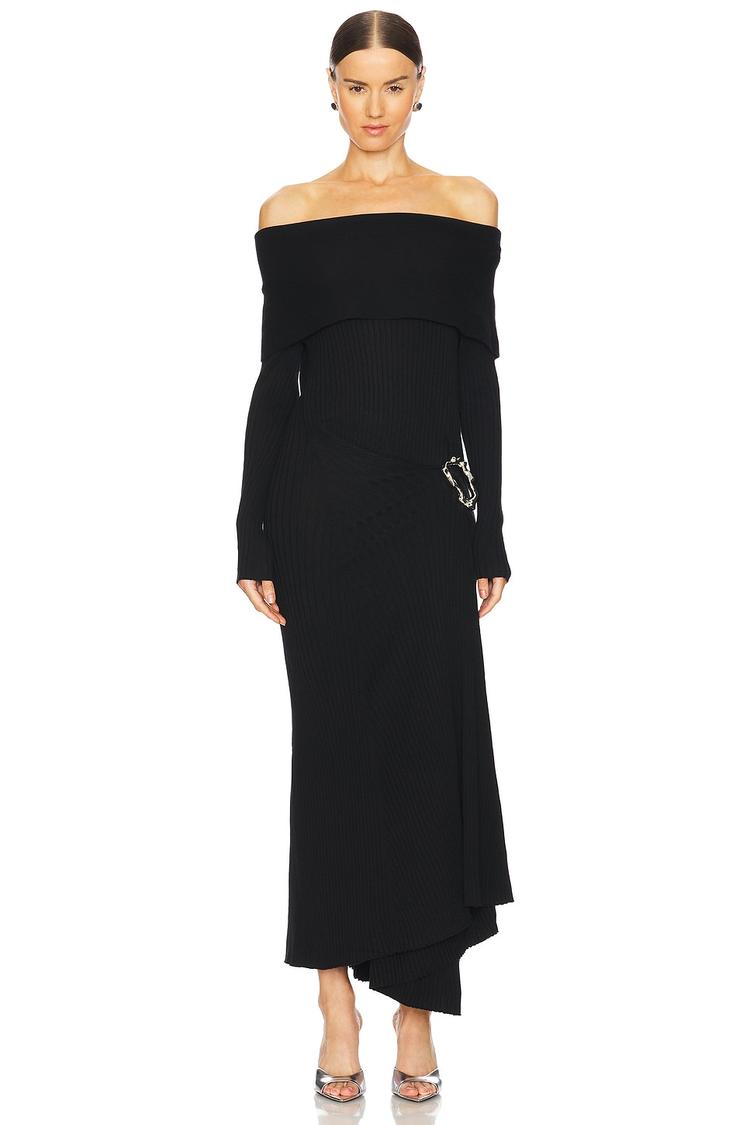 A sleek column silhouette meets a striking off-shoulder foldover neckline in this elegant black maxi dress crafted from ribbed cotton jersey. The slim fit and long sleeves create a sophisticated look perfect for cocktail parties, date nights, or stylish evenings out. Silver-tone buckle hardware on the sleeves adds a modern edge to the minimalist design, while the asymmetric hemline offers a subtle twist on classic elegance. Comfortable and versatile, this slip-on dress suits all seasons and occasions where refined style is key.