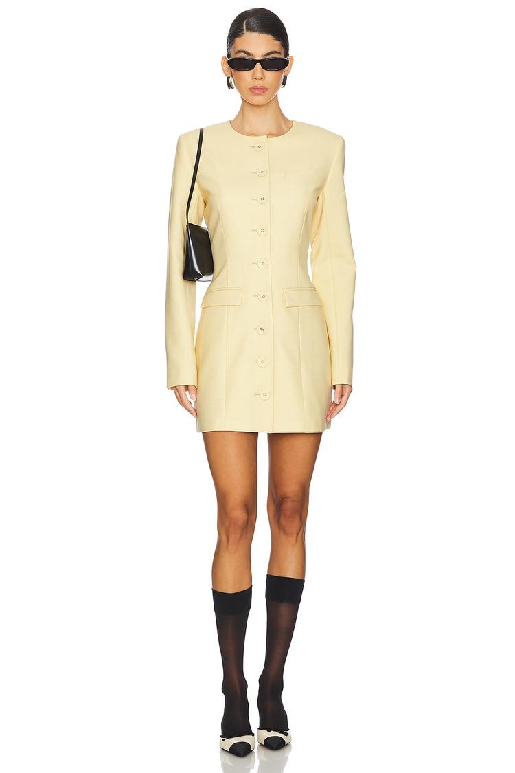 Matte beige crepe fabric shapes a fitted blazer dress featuring a round neck and long cuffed sleeves, perfect for a polished look. The mini length and clean hemline enhance its sleek silhouette, while padded shoulders add structure and elegance. Front button closure with flap pockets and a single breast pocket deliver functional style. Fully lined for comfort, this versatile dress suits workwear, business casual events, brunches, and sophisticated date nights with ease.