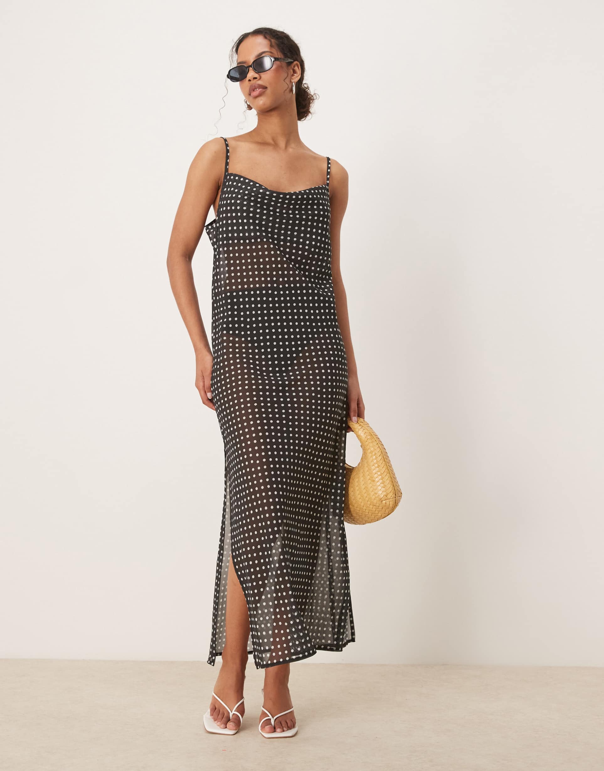 Soft chiffon fabric and a flowing maxi hem define this elegant slip dress, featuring a flattering cowl neck and slender adjustable spaghetti straps. The regular fit skims the body with ease, while playful white polka dots on a matte black base add a timeless charm. Side slits enhance movement and breeziness, perfect for warm summer or spring days. Ideal for beach outings, casual vacations, or relaxed daytime events, this dress combines comfort and style effortlessly.