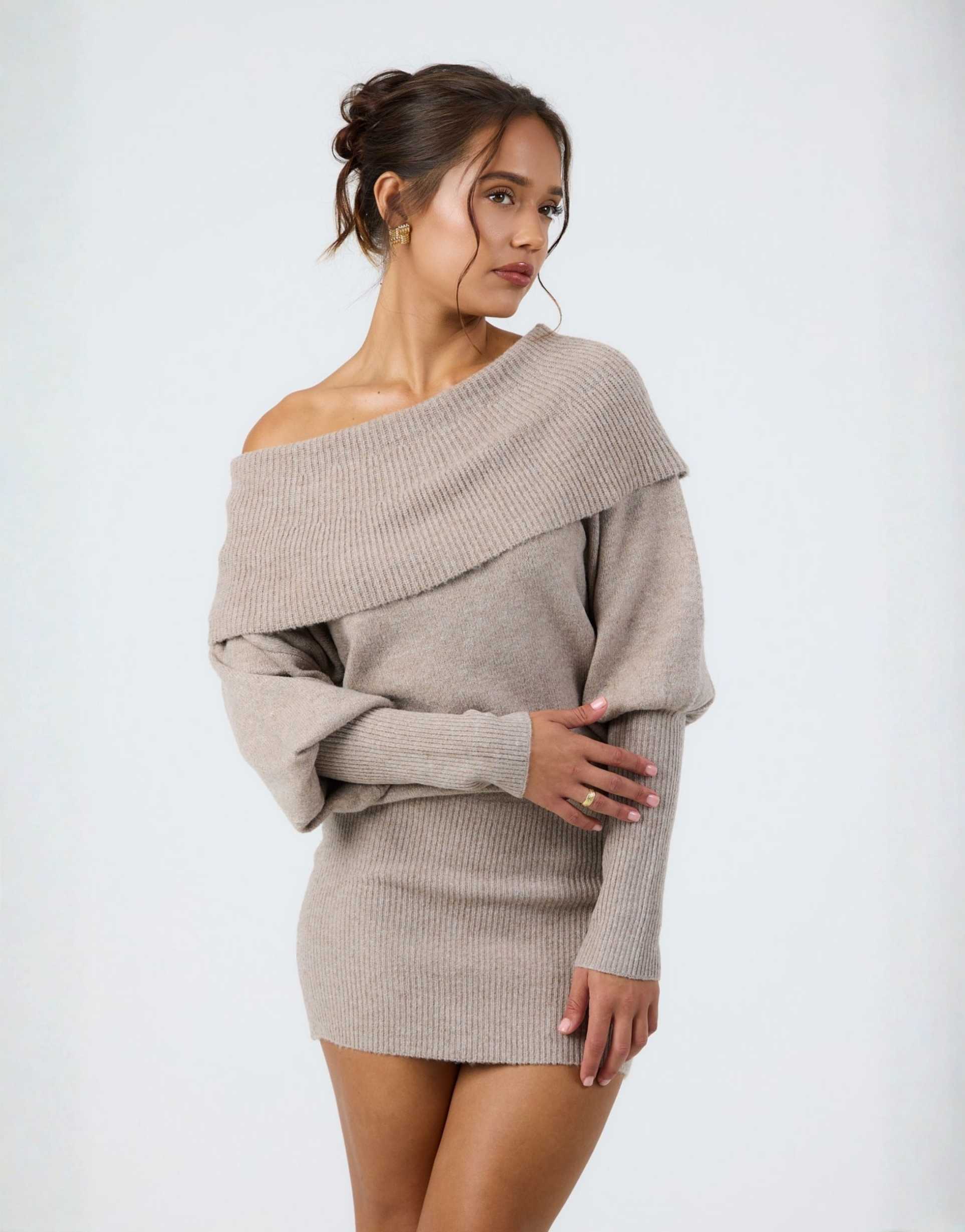 ARIA COVE ASYMMETRIC DEEP OFF THE SHOULDER BALLOON SLEEVE KNIT MINI SWEATER DRESS IN OAT