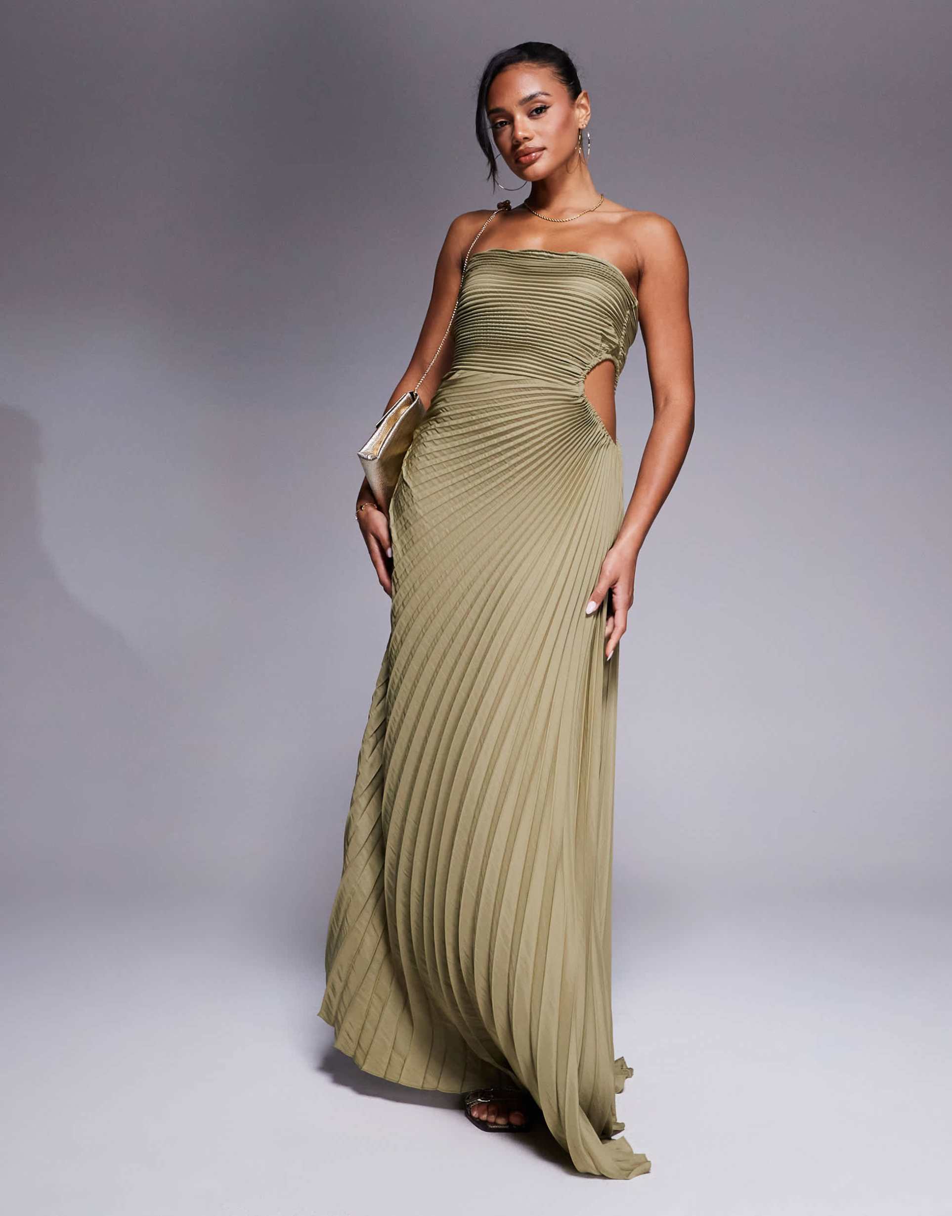 ARIA COVE BANDEAU OPEN SIDE PLEATED MAXI DRESS IN OLIVE