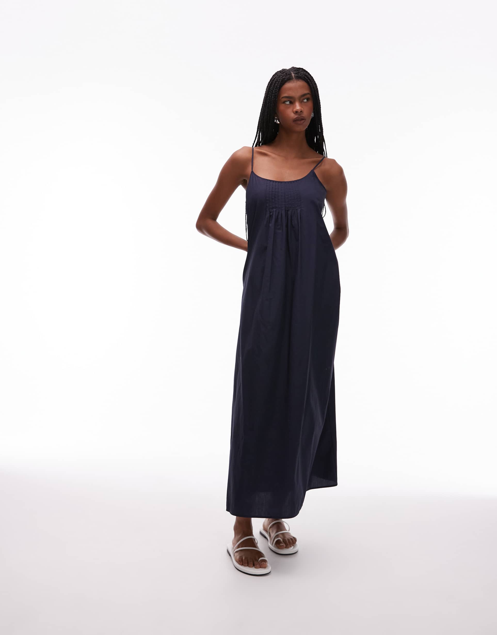 Soft cotton poplin in a matte blue hue brings effortless style to this maxi slip dress featuring delicate pintuck details and a flattering scoop neckline. The spaghetti straps and tie-back closure add a casual chic touch while ensuring a comfortable regular fit. Perfect for summer beach days, vacation getaways, or relaxed weekend outings, this dress combines breathable cotton fabric with a clean hemline for timeless versatility.