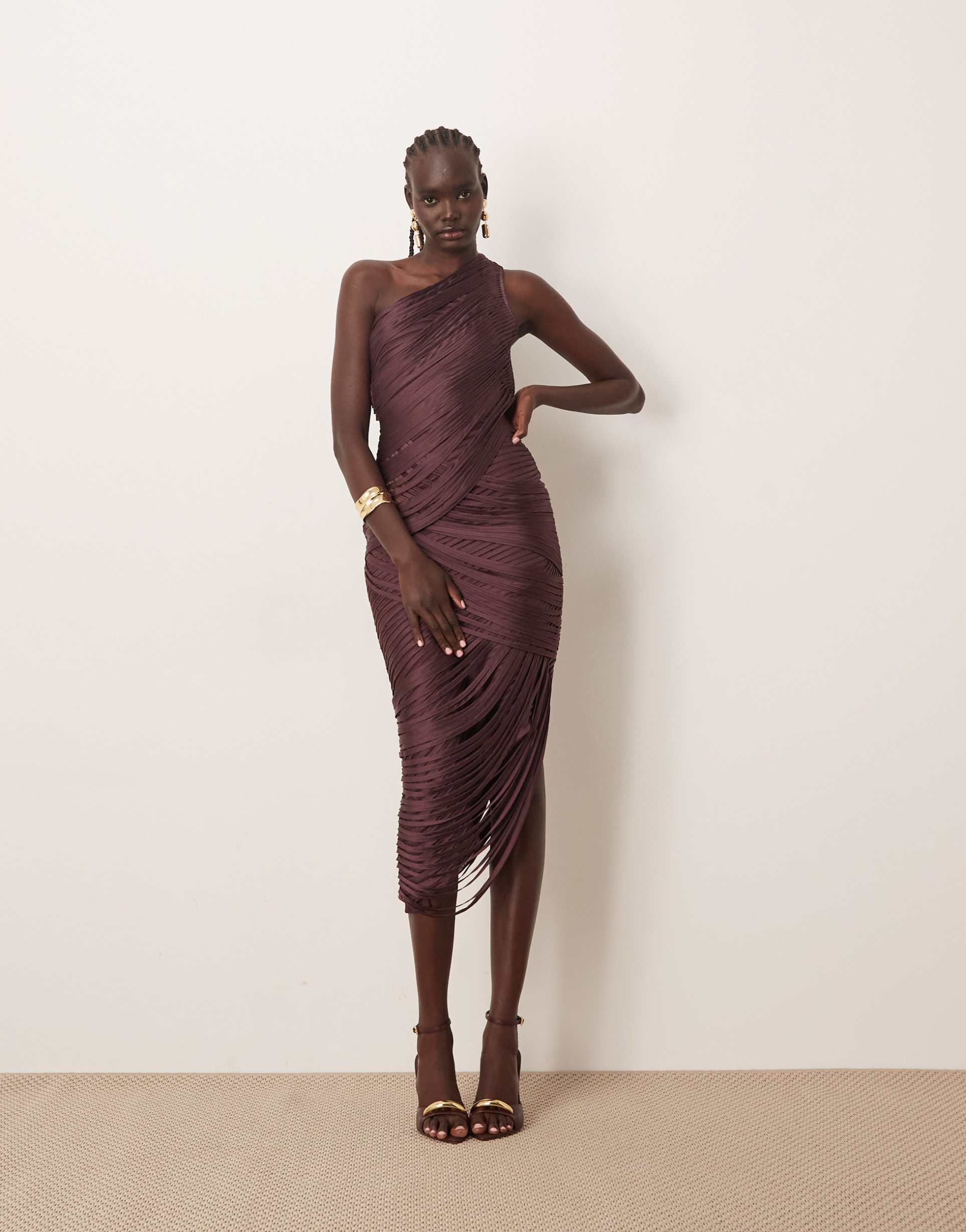 ARRANGE ASYMMETRIC DRAPED FRINGE ONE SHOULDER MIDAXI DRESS IN BURGUNDY