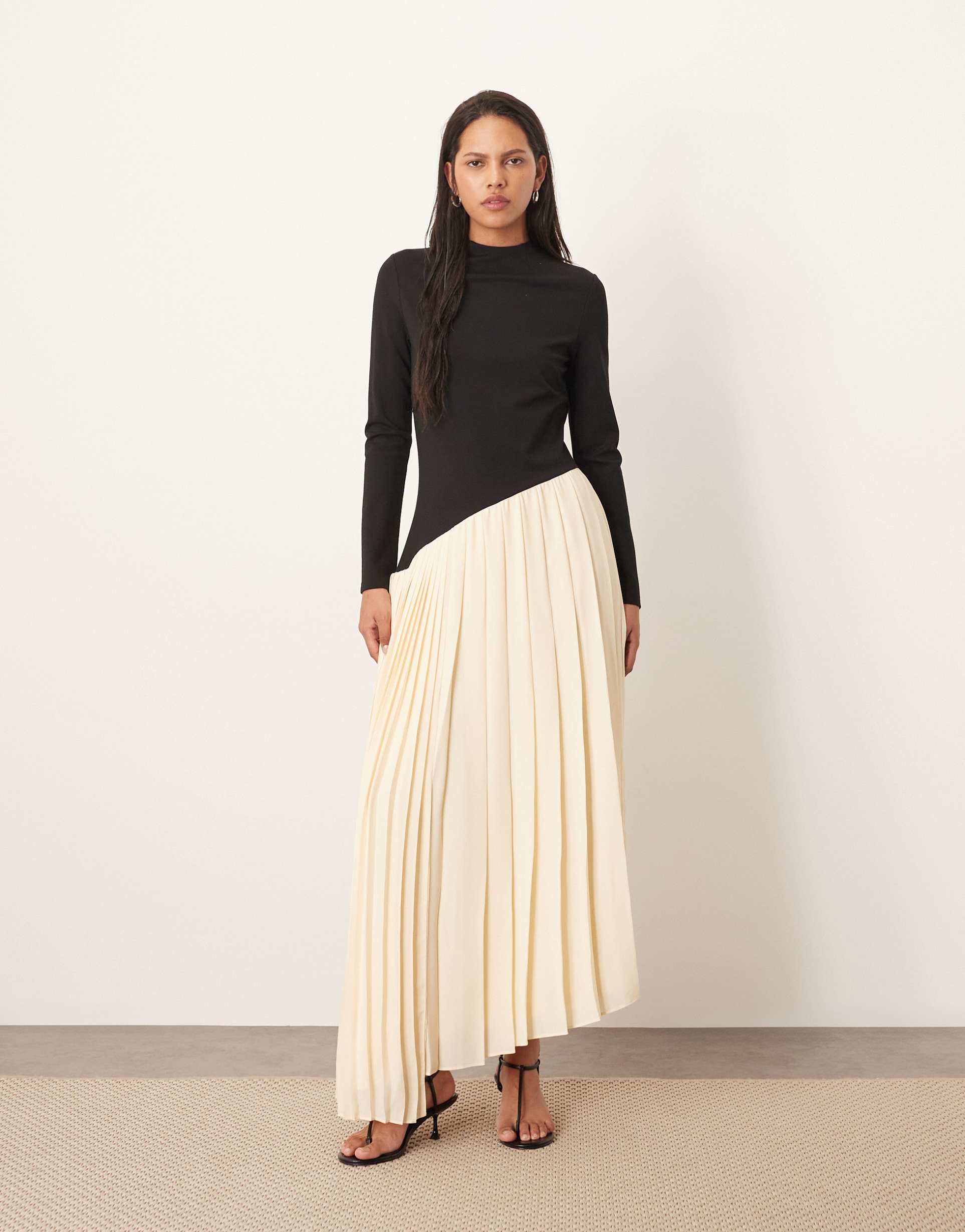 ARRANGE CONTRAST FABRIC SCULPTED MAXI DRESS WITH PLEAT SKIRT IN BLACK