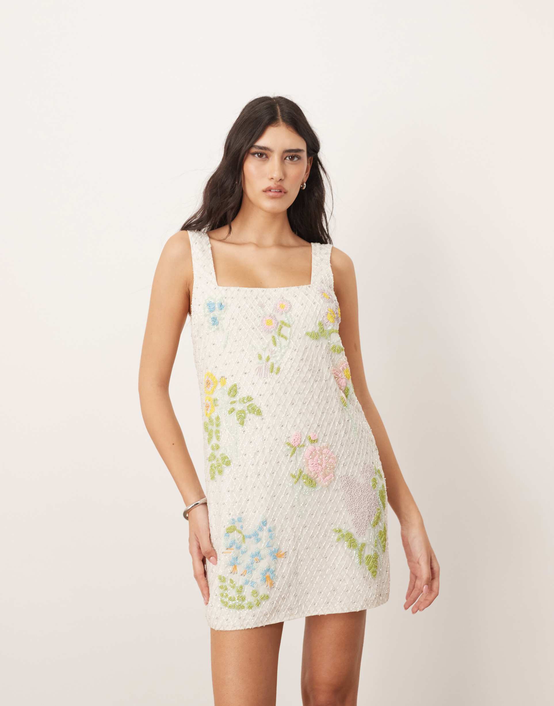 ARRANGE EMBELLISHED BOTANICAL FLORAL BEADED SQUARE NECK MINI DRESS IN WHITE