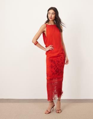 ARRANGE EMBROIDERED DRAPE BACK MIDI DRESS WITH FRINGE HEM IN RED