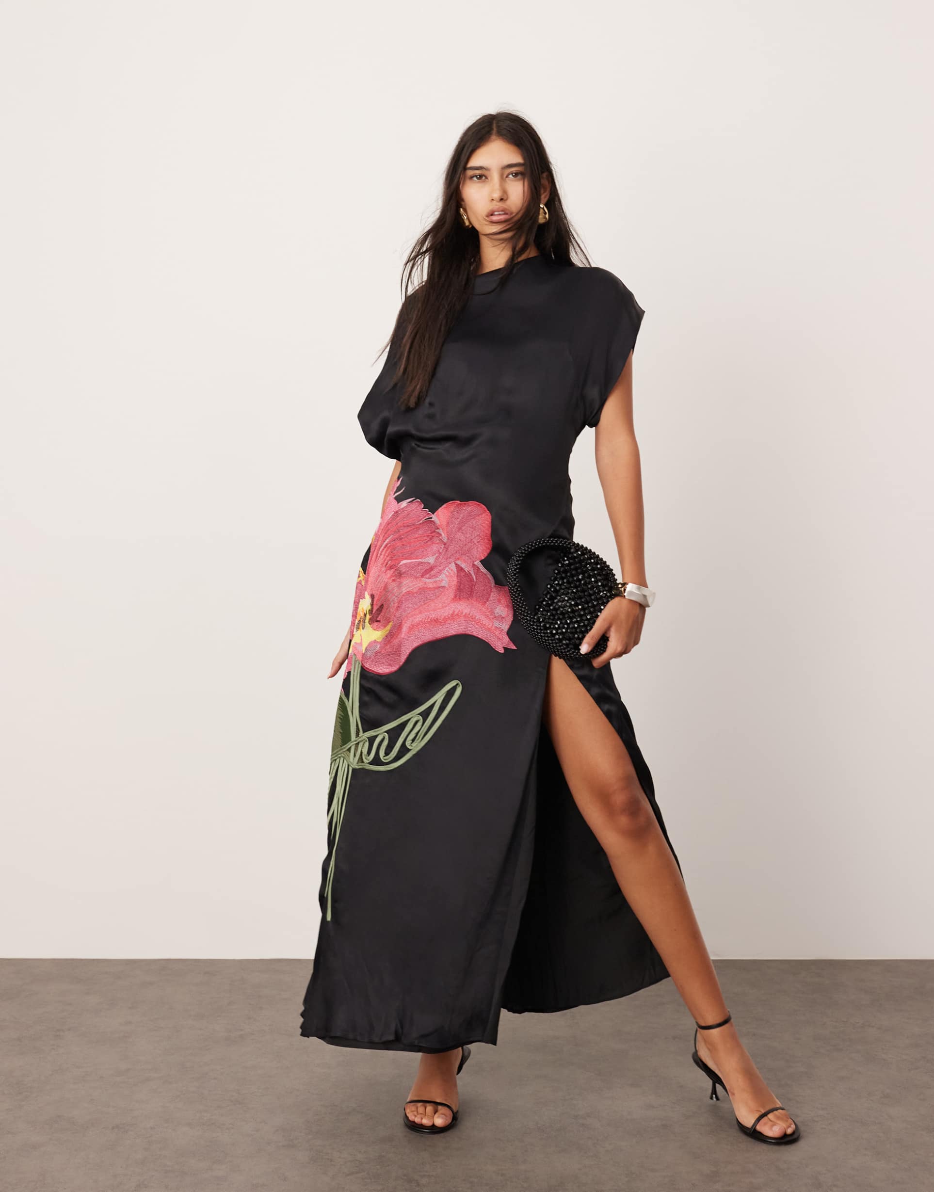ARRANGE EMBROIDERED FLORAL ASYMMETRIC MAXI DRESS IN BLACK