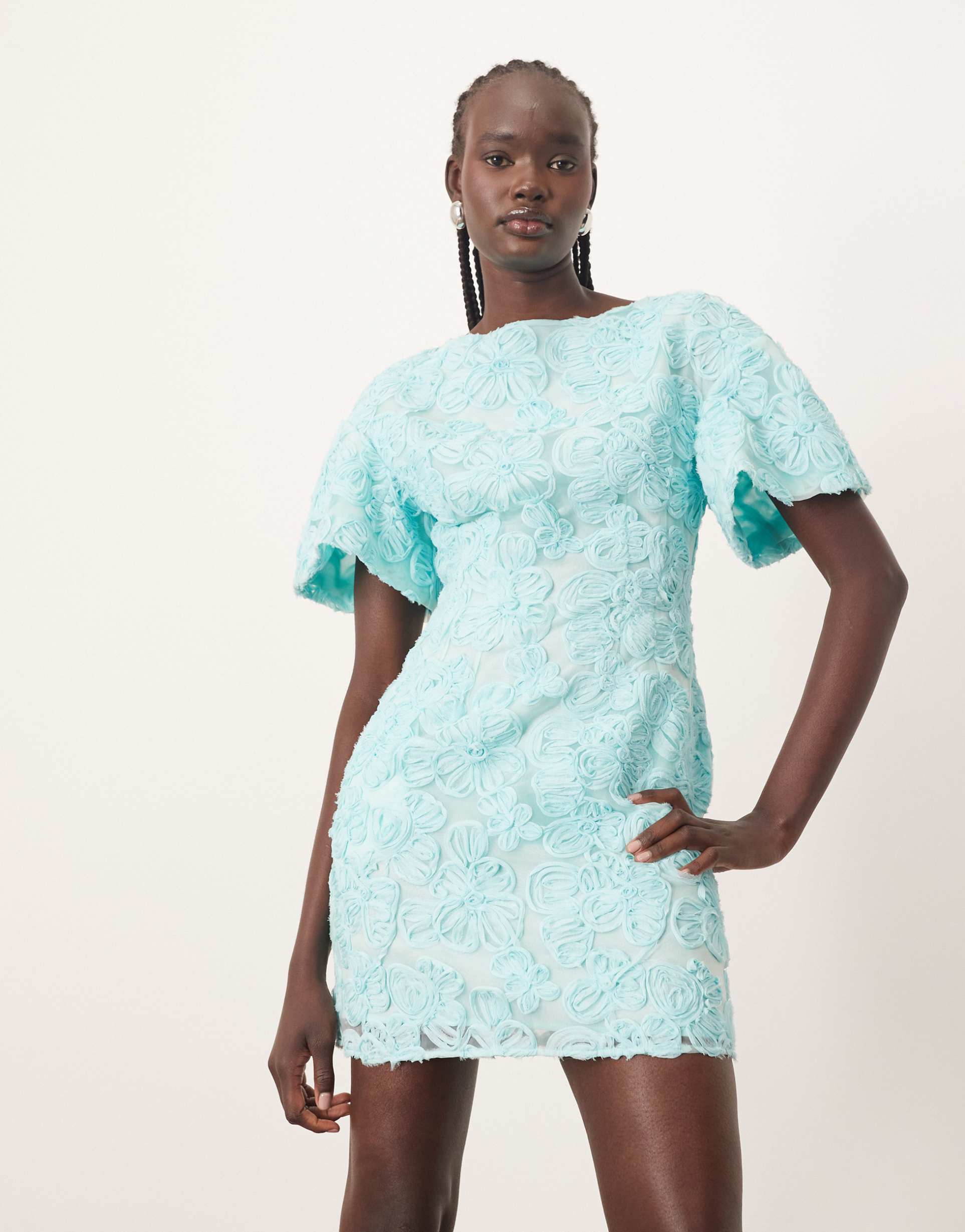 ARRANGE EMBROIDERED FLORAL DOME T-SHIRT SLEEVE MINI DRESS IN BLUE