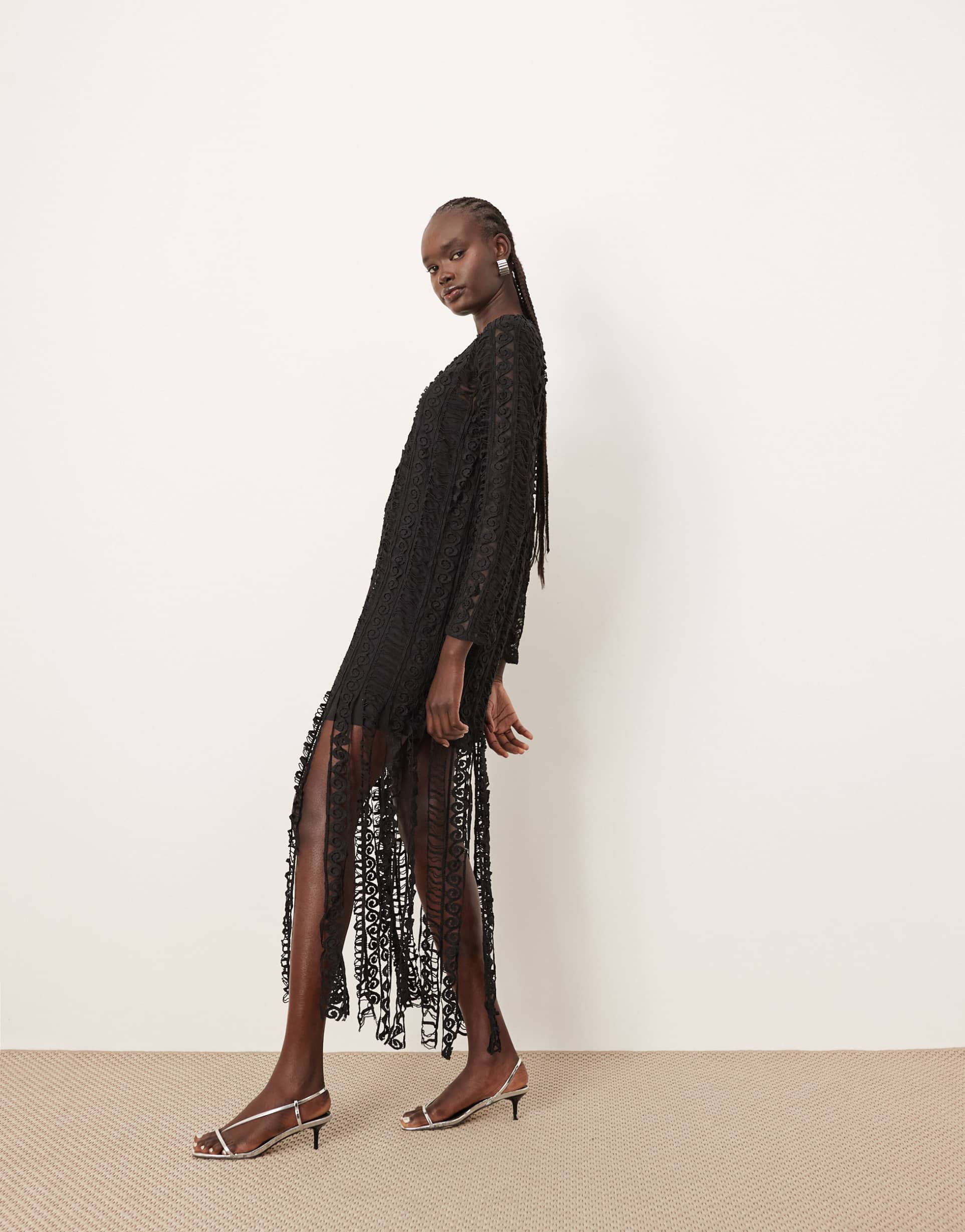 ARRANGE EMBROIDERED LACE LONG SLEEVE MIDI DRESS WITH FRINGE HEM IN BLACK