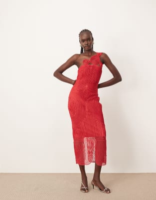 ARRANGE EMBROIDERED SATIN CORNELLI ONE SHOULDER MAXI DRESS IN RED