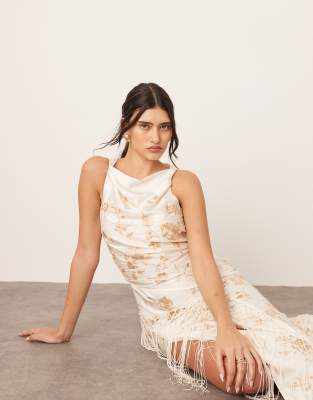 Glossy satin fabric and a draped boat neckline define this elegant slip dress, featuring delicate beige floral embroidery across an off-white base. The midi length silhouette with a side slit and fringed hem adds movement and subtle allure. Its regular fit and sleeveless styling make it a versatile choice for spring and summer occasions such as brunch, date nights, and cocktail events. The fringe detail along the hemline enhances the classic yet sophisticated look, making it a standout piece for refined gatherings.