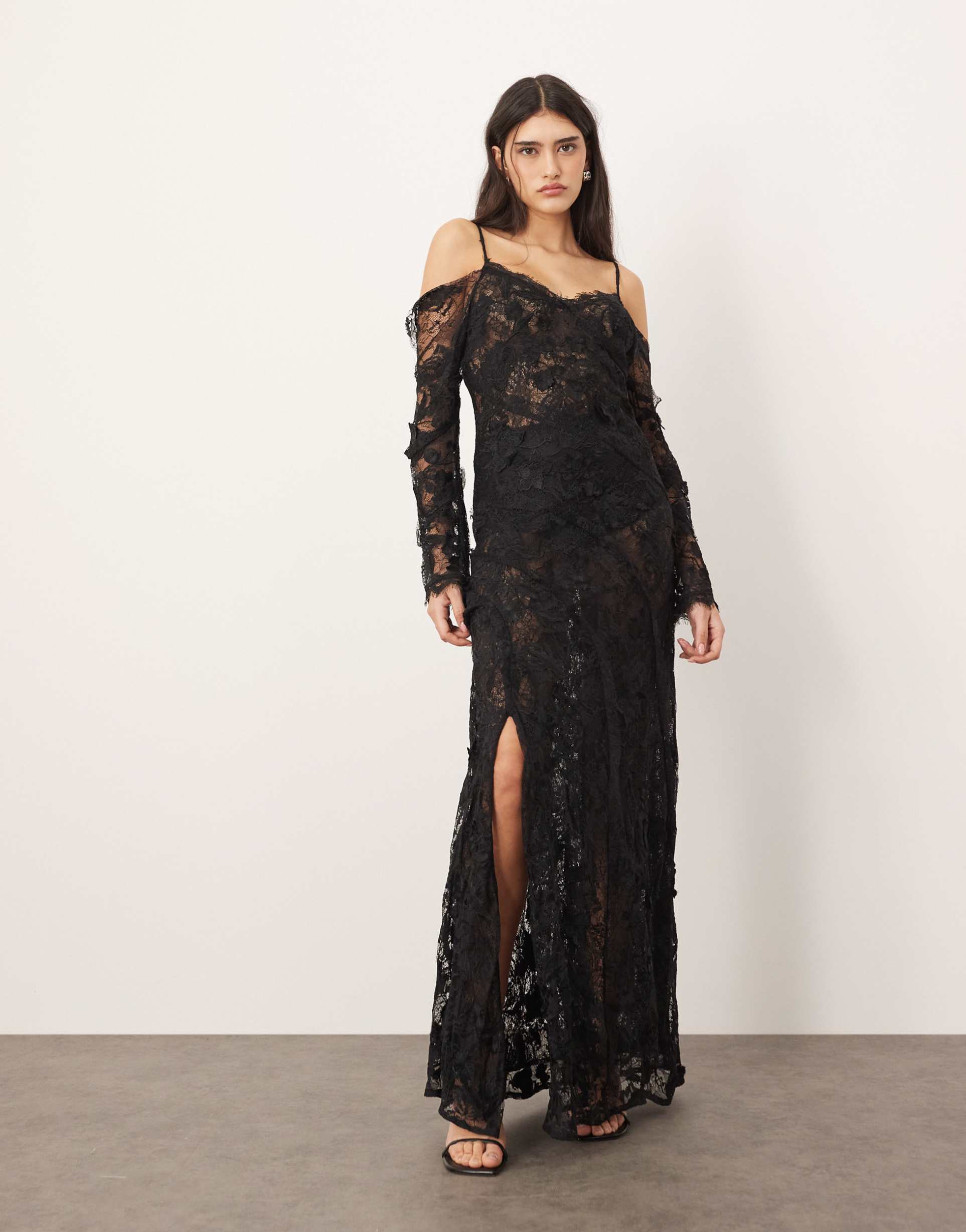 Intricate lace fabric and a sleek column silhouette define this matte black maxi dress with a sophisticated scoop neck and long cold-shoulder sleeves. The regular fit and side slit add graceful movement and subtle allure, making it perfect for cocktail parties, formal events, or elegant nights out. Crafted from delicate lace layered over nylon, it combines refined texture with comfortable wearability. Adjustable straps enhance fit, while the clean hemline completes the polished look, offering a timeless and versatile piece for your wardrobe.