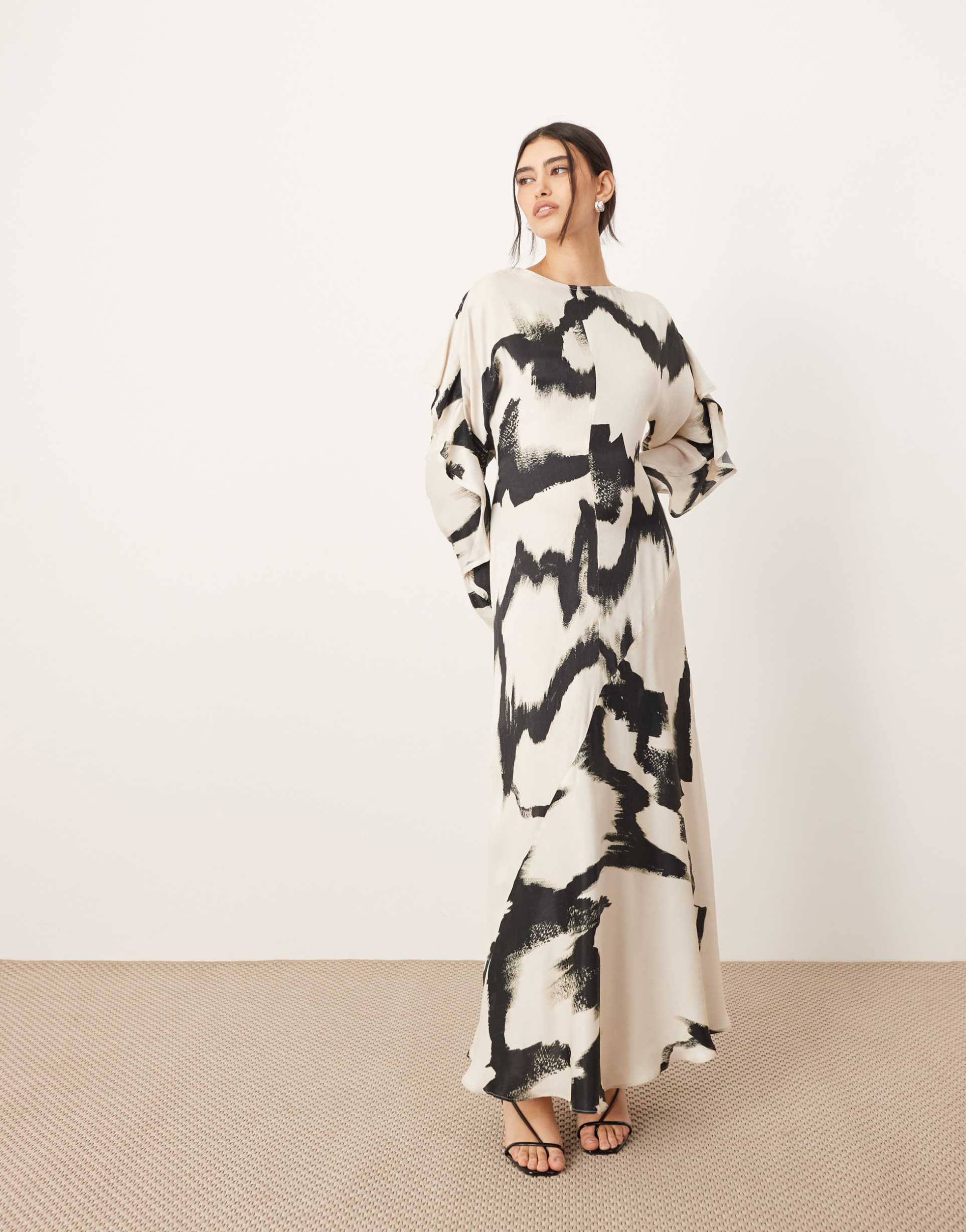 ARRANGE RUFFLE OPEN BACK LONG SLEEVE MAXI DRESS IN MONO ABSTRACT PRINT