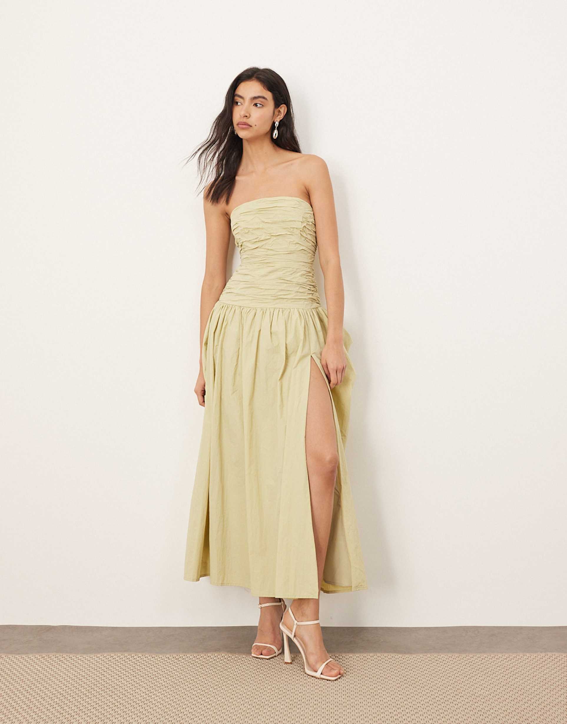 Soft nylon fabric with a smooth, crisp texture highlights this light olive midi dress featuring a square neckline and strapless bandeau silhouette. The regular fit combined with ruching detail across the bodice and a thigh-high side slit adds subtle allure and movement. Its covered back with a zip closure ensures a sleek finish. Ideal for spring and summer occasions, this elegant shift dress suits brunch dates, cocktail evenings, or romantic outings with effortless charm.