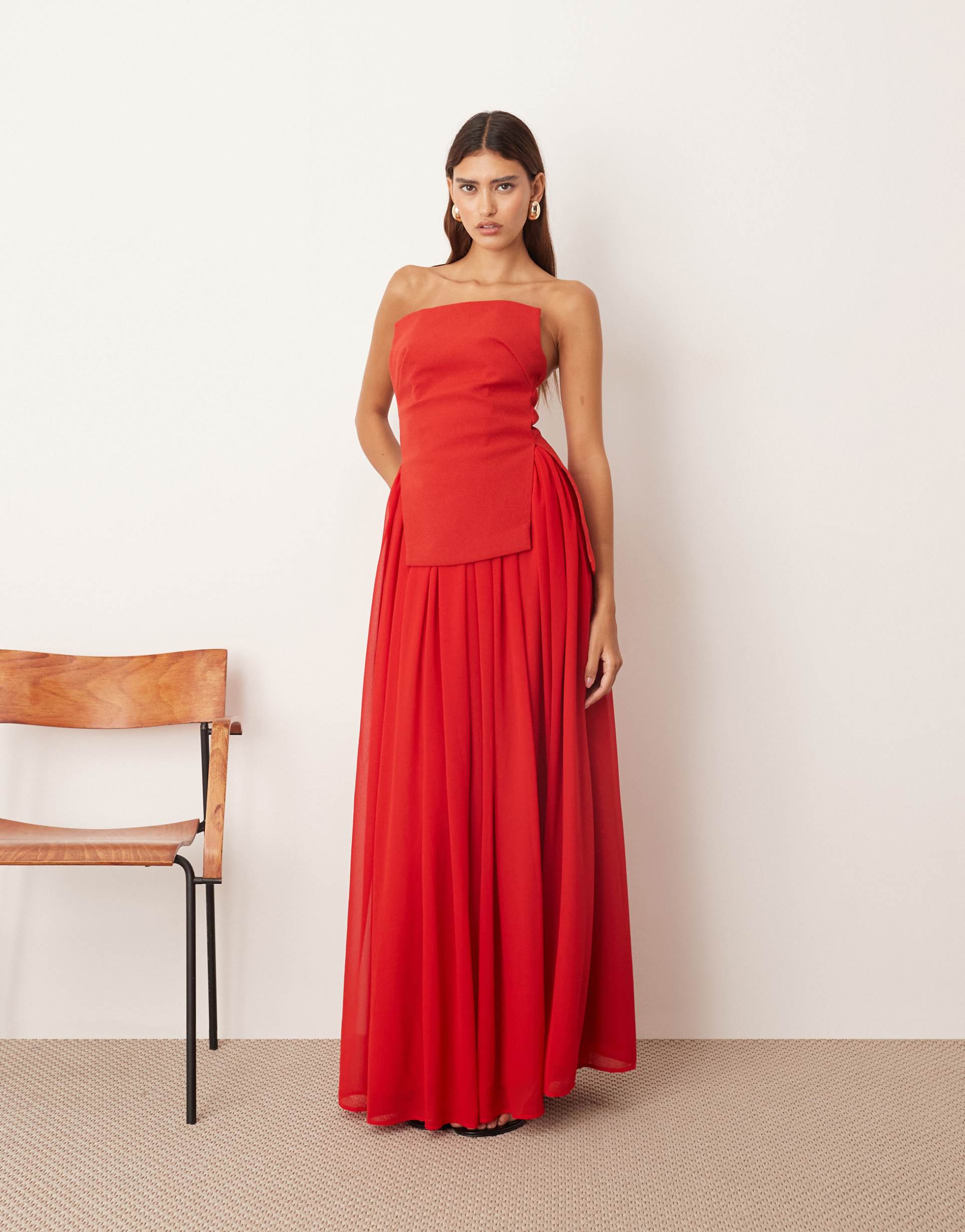 ARRANGE STRUCTURED BANDEAU MAXI DRESS WITH VOLUMINOUS SKIRT IN RED