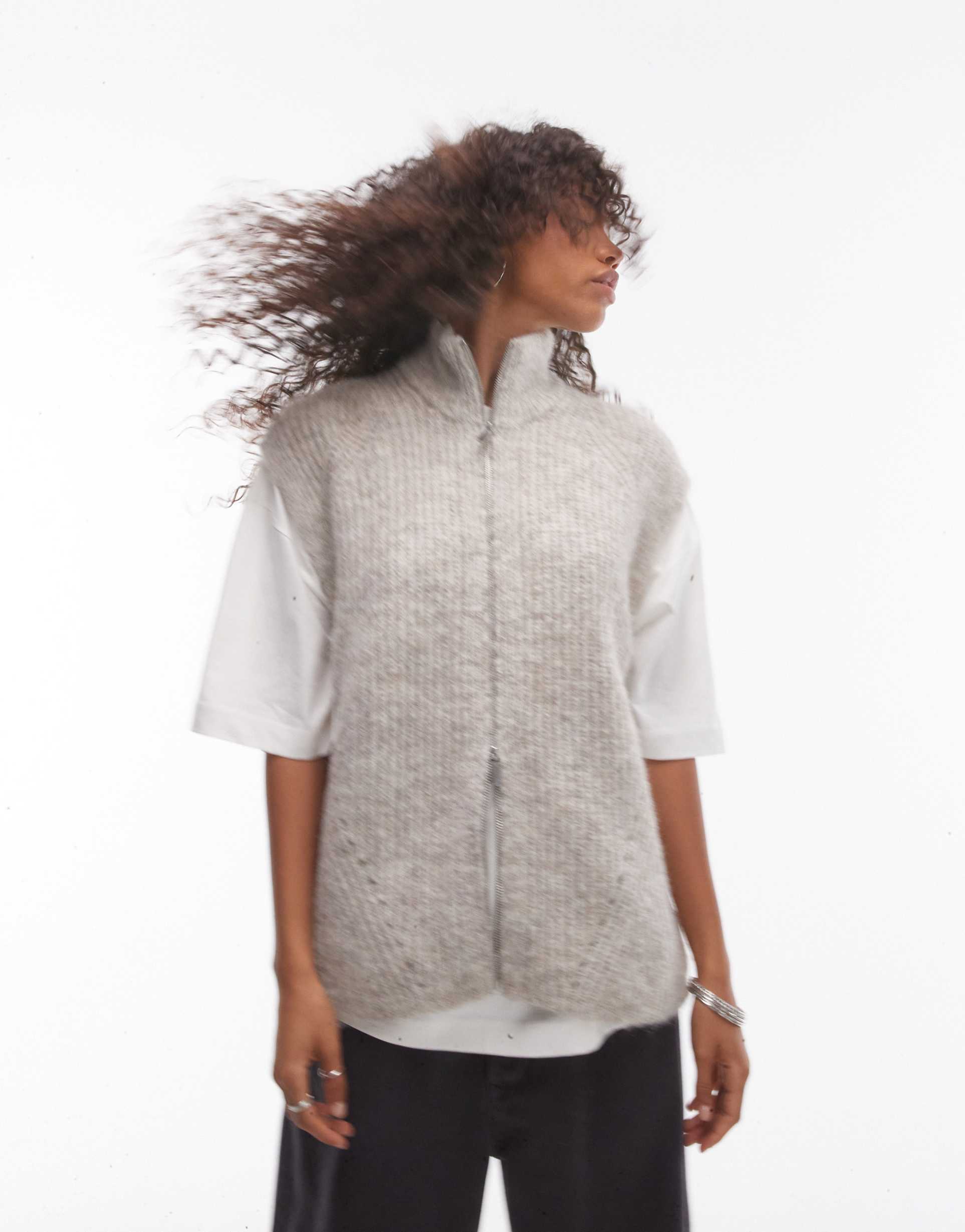 Wrap yourself in effortless coziness with this oat-toned wool-mix knit longline vest from Topshop. The sleeveless, oversized tank features a high neckline and a clean front zip, delivering a modern, sporty-chic silhouette that layers beautifully over tees, blouses, or lightweight knits. The hip-length hem creates a flattering elongated line, while the soft, stretchable knit adds everyday comfort. Dress it up with tailored trousers for work, or pair with denim for weekend ease. Perfect for autumn days or cool summer evenings, this versatile piece bridges laid-back comfort with refined polish.