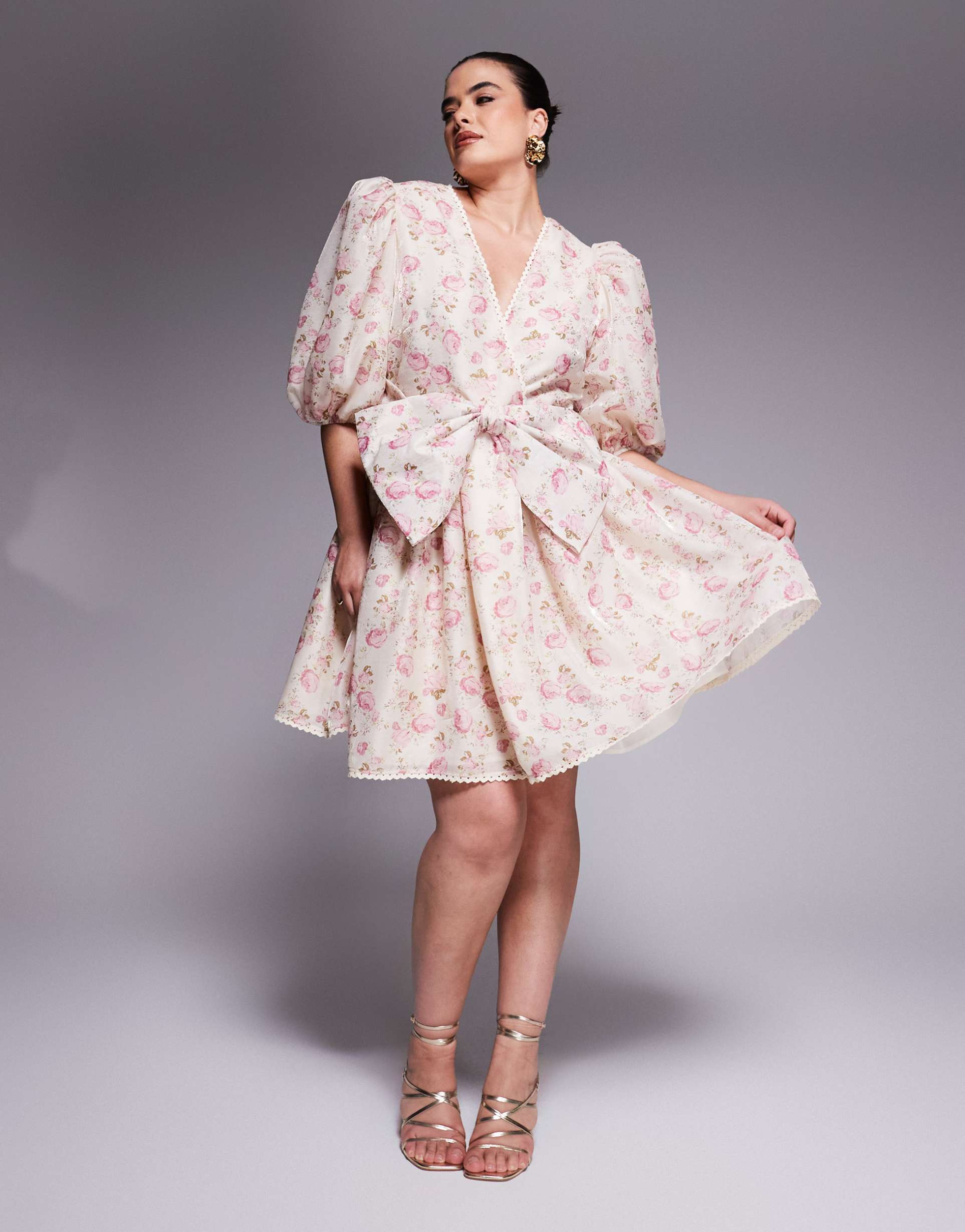 ASOS LUXE CURVE JACQUARD PUFF SLEEVE MINI DRESS WITH BOW TIE IN FLORAL PRINT