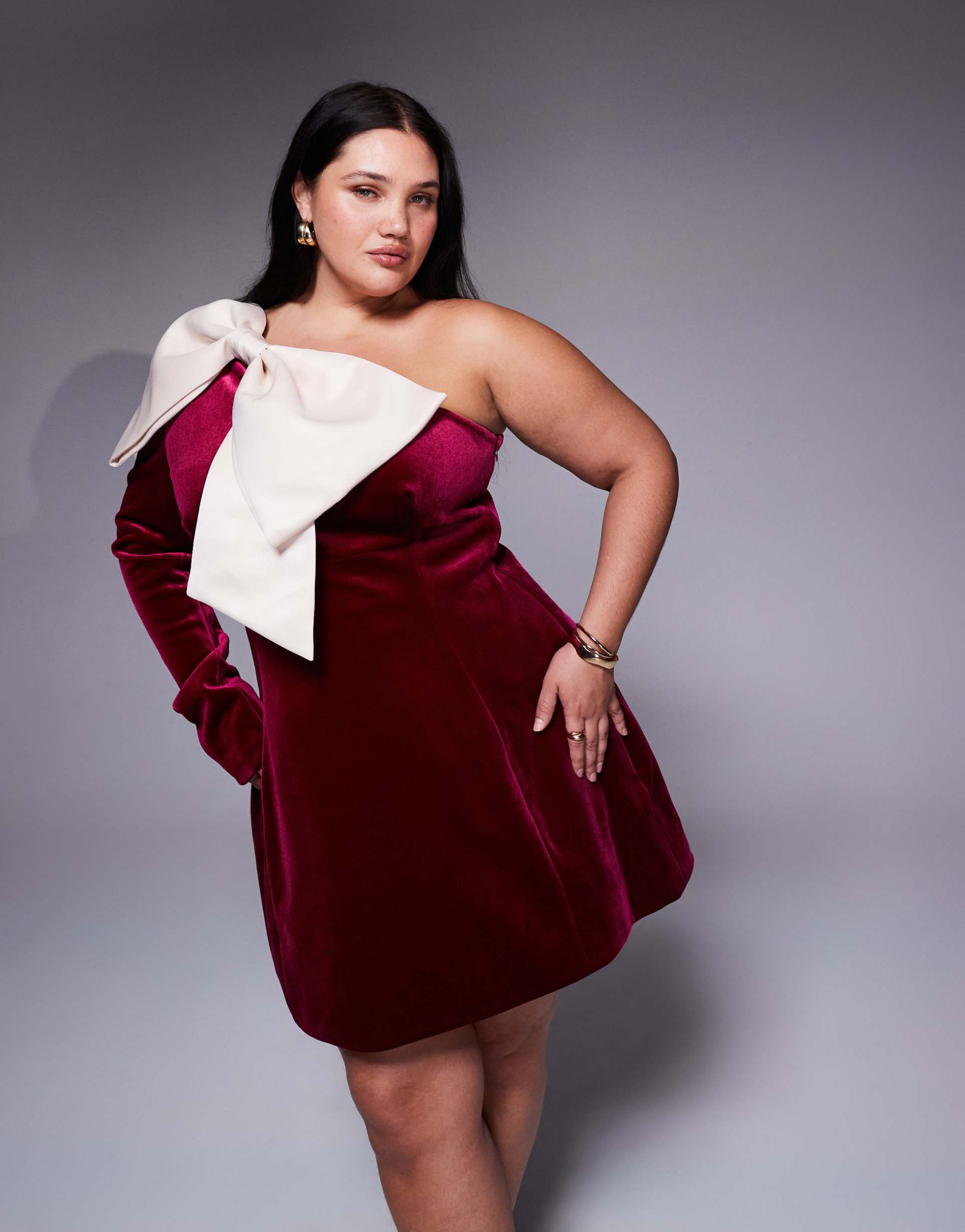ASOS LUXE CURVE ONE SHOULDER VELVET MINI DRESS WITH BOW DETAIL IN BURGUNDY