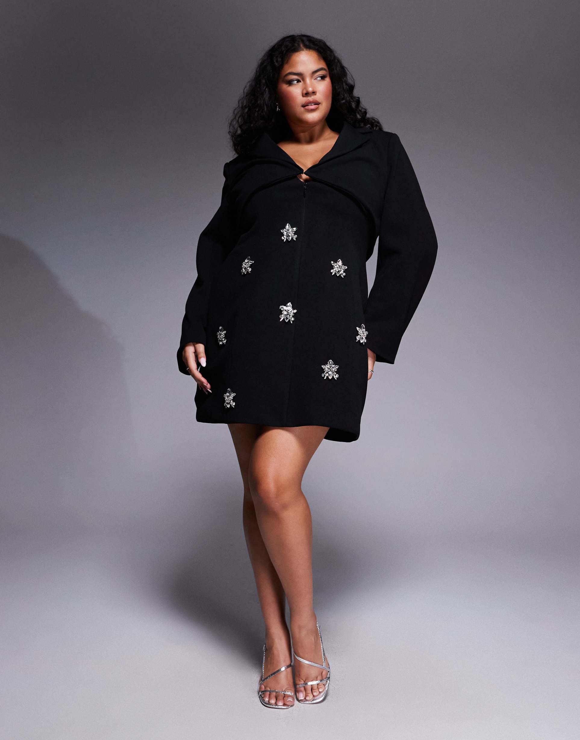 A structured blazer dress in matte black, adorned with sparkling silver jewel embellishments at the front, offers a refined and sophisticated silhouette. Featuring a notch lapel collar and long regular sleeves, this mini-length dress combines modern tailoring with elegant design details. The regular fit and front zipper closure provide comfort and ease, making it ideal for autumn and winter evenings. Perfect for cocktail parties, date nights, and semi-formal events, this ASOS Luxe piece seamlessly blends polished style with plus-size tailoring.