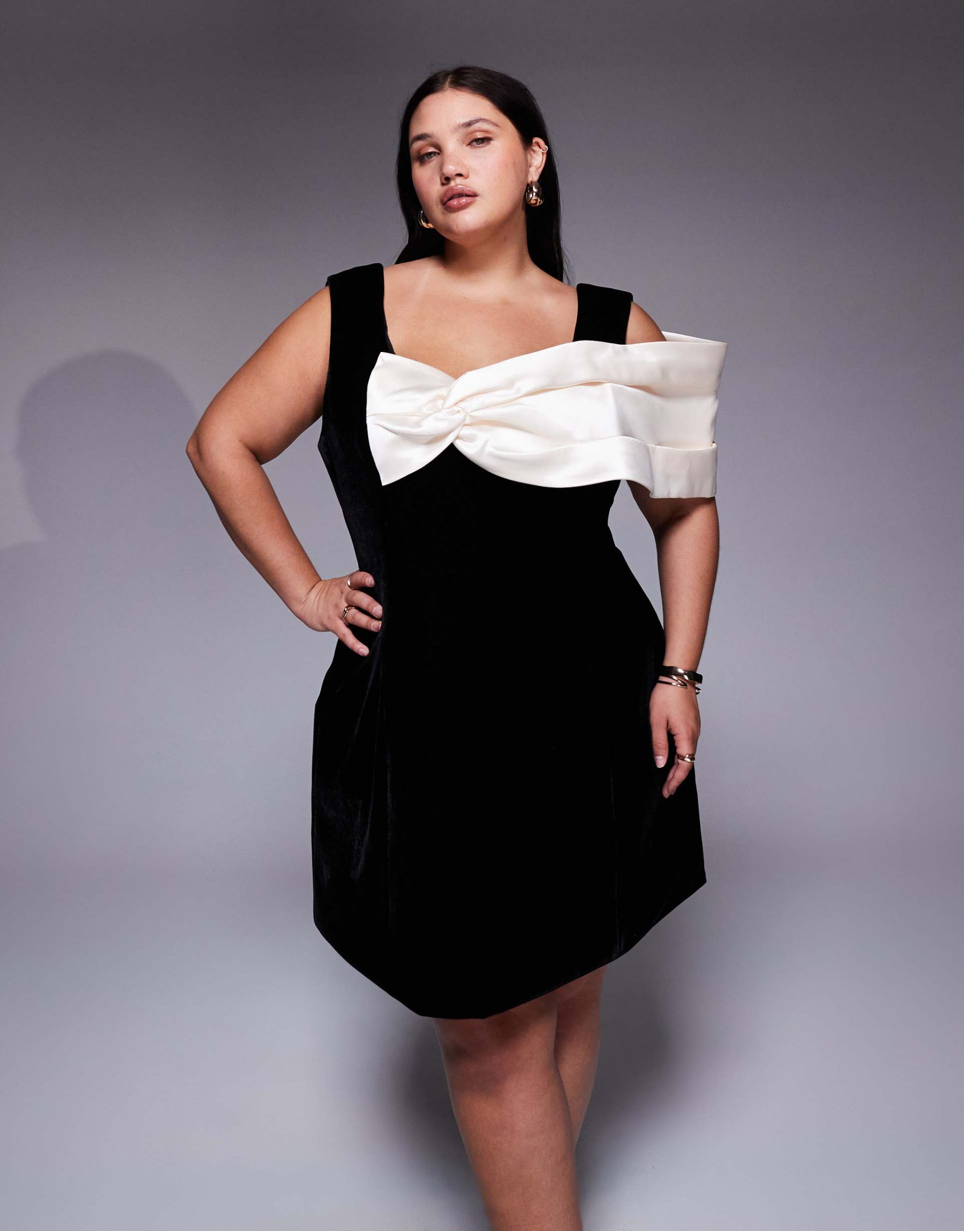 ASOS LUXE CURVE VELVET MINI DRESS WITH STRUCTURED SATIN DRAPE IN BLACK