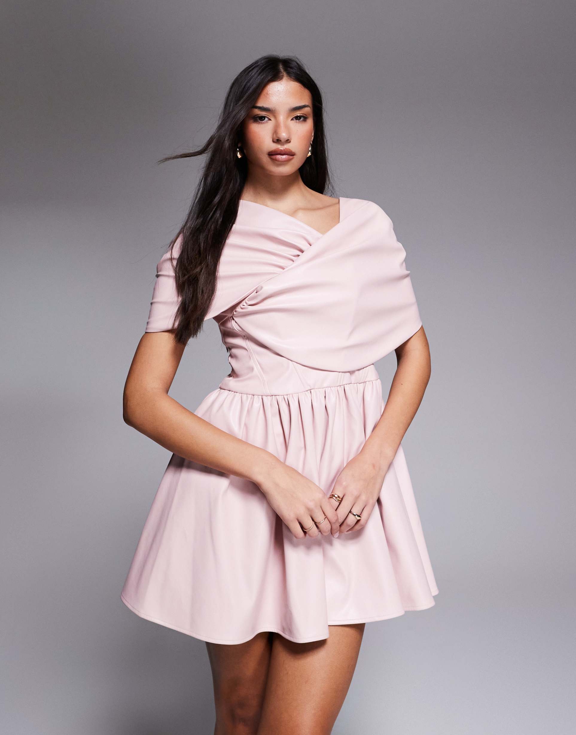 ASOS LUXE FAUX LEATHER BARDOT SKATER DRESS IN DUSKY PINK