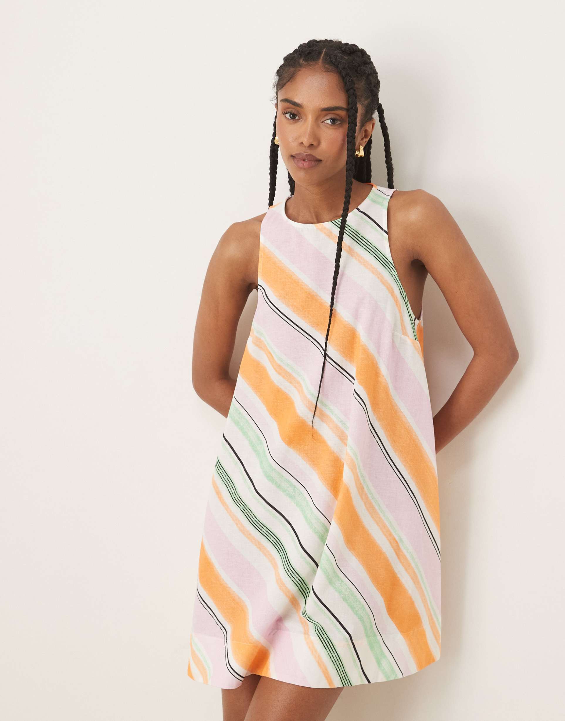 Soft, breathable cotton-linen blend fabric brings comfort to this A-Line mini dress, perfect for warm spring and summer days. Its clean hemline and casual chic striped pattern in orange, pink, and green create a fresh, vibrant look. The round neckline and sleeveless silhouette enhance its easy-going style, while a button-keyhole back adds a subtle design detail. Ideal for casual outings, brunches, or vacation wear, this regular fit dress combines minimalist style with playful stripes to brighten your wardrobe.