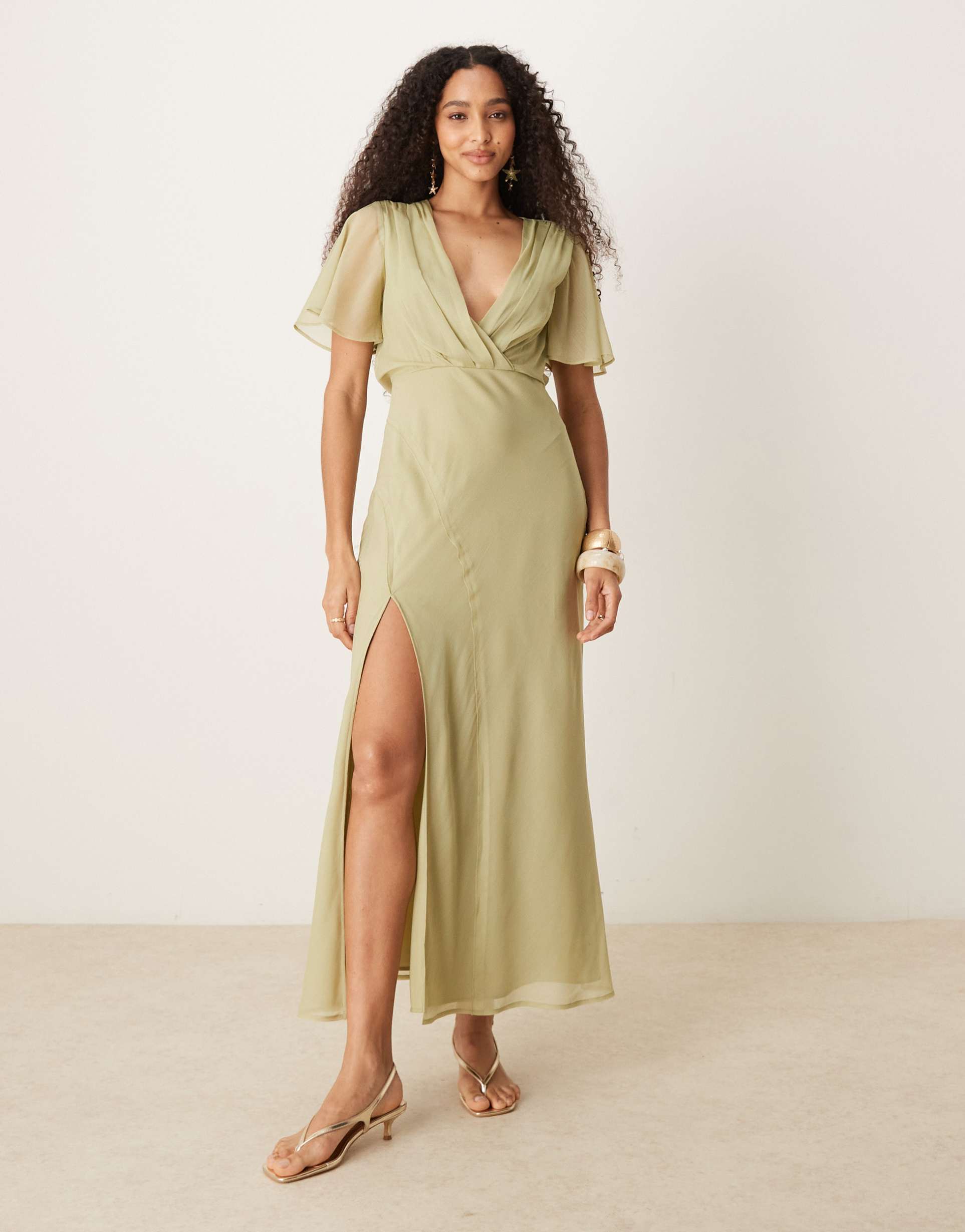 Soft chiffon and a flowing midi silhouette with a deep V-neck create an effortlessly elegant look in this sage green wrap dress. Angel sleeves add a delicate touch, while seaming details enhance the front fit. The tie-back fastening and side slit contribute to both style and comfort. Ideal for spring and summer, this dress suits casual outings, brunches, and romantic date nights with ease.
