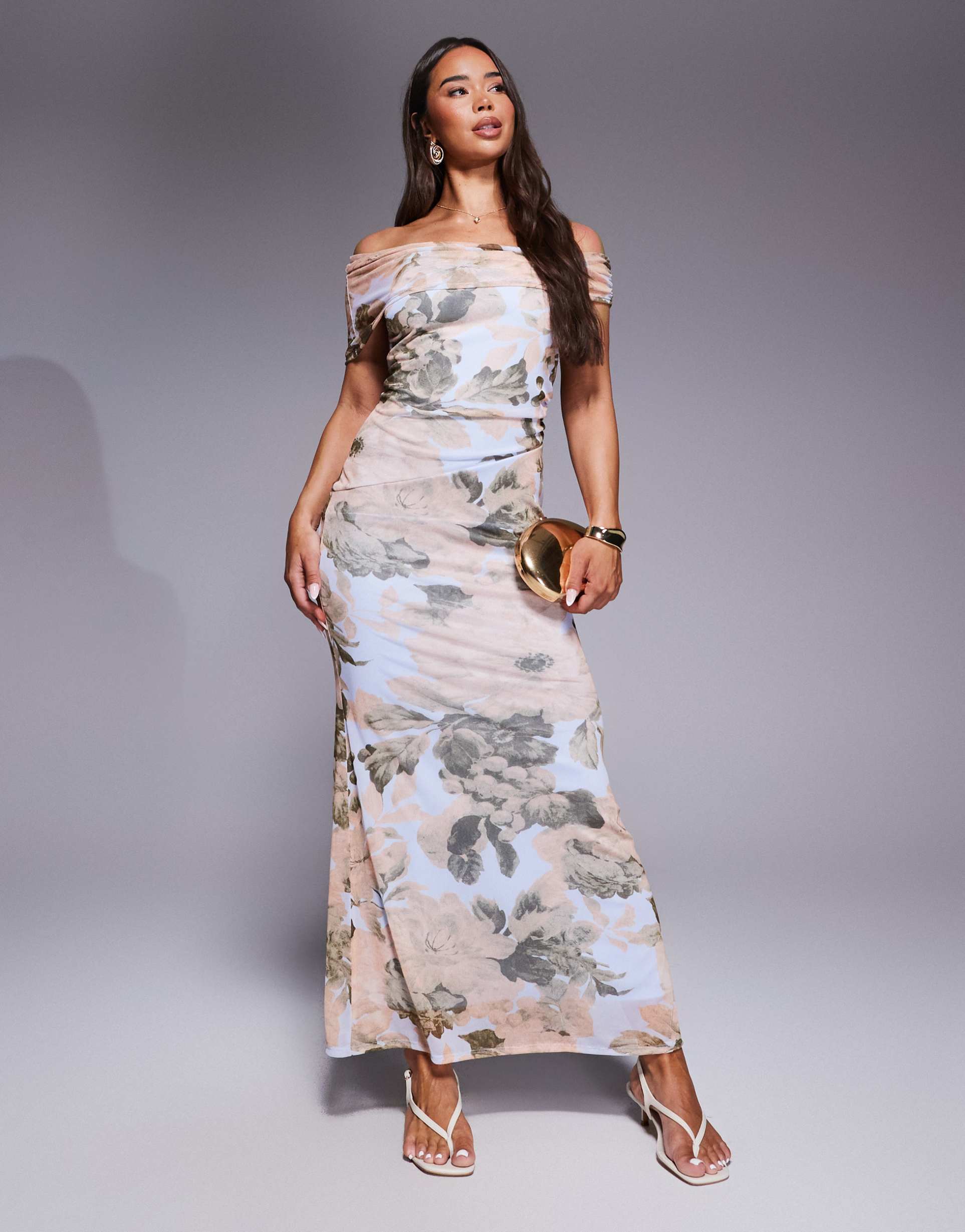 ASOS DESIGN ASYMMETRIC BARDOT MESH MAXI DRESS IN FLORAL PRINT