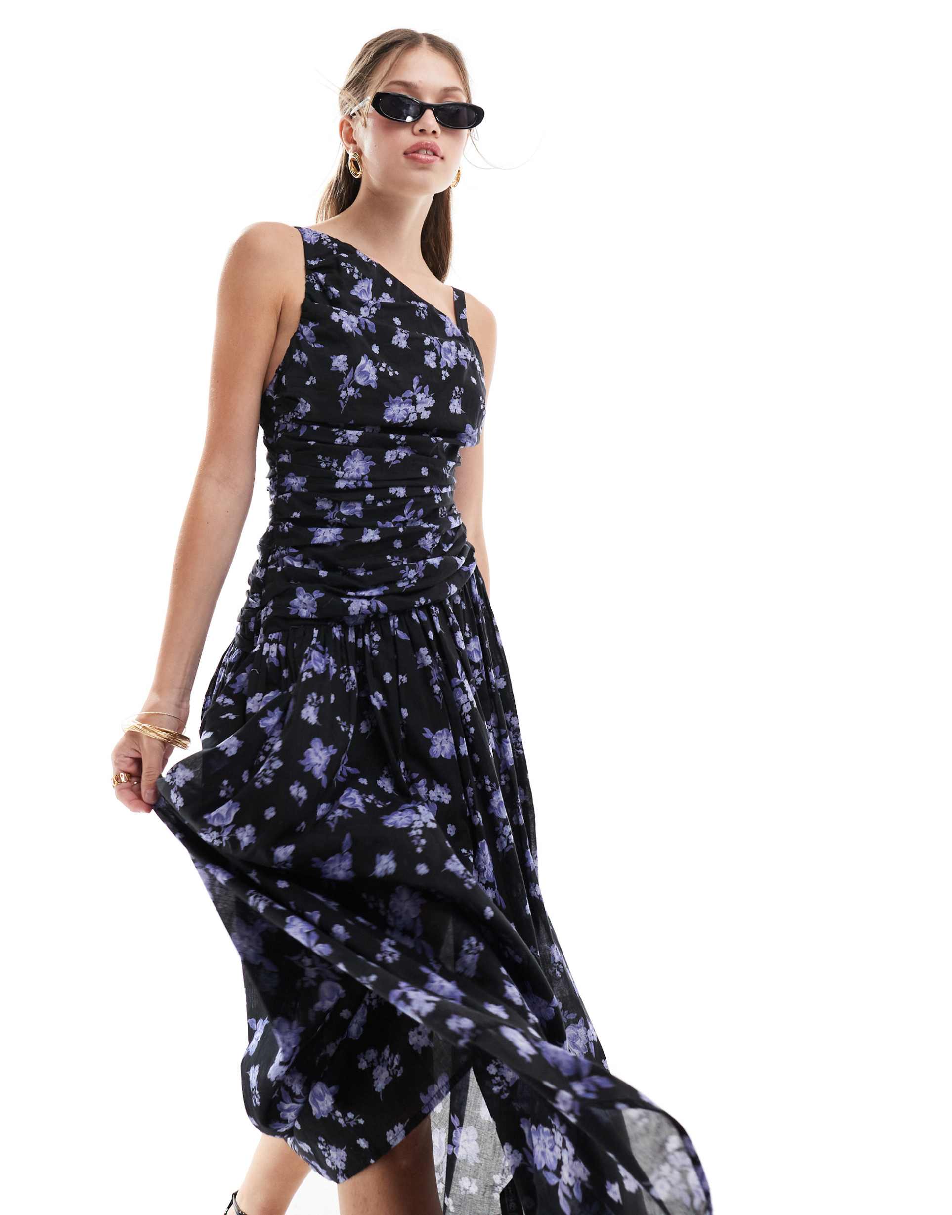 ASOS DESIGN ASYMMETRIC CROSS STRAP MIDI DRESS IN DARK FLORAL