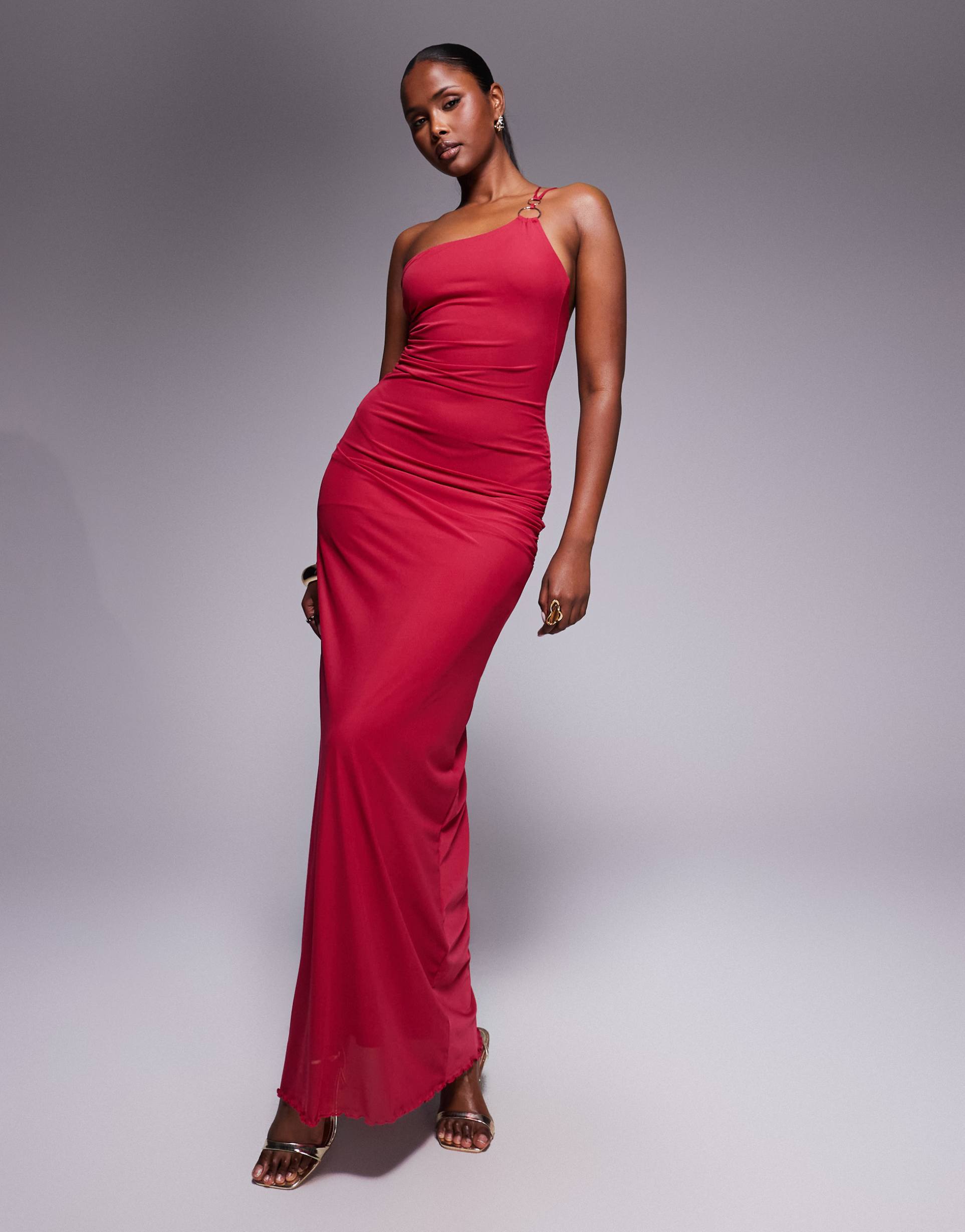 ASOS DESIGN ASYMMETRIC DOUBLE STRAP WITH GOLD TRIM DETAIL WITH RUCHING MESH MAXI DRESS IN RED