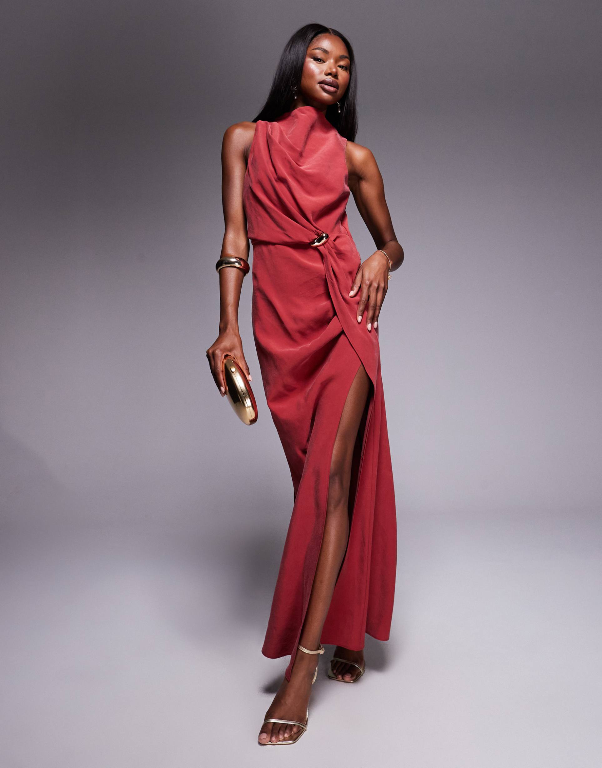 An asymmetric neckline and sleek column silhouette combine with a thigh-high slit to create a striking maxi dress in matte dark red. The sleeveless design and open back add to the sophisticated appeal, while the gold-tone hardware buckle detail at the front enhances its elegant style. Crafted from a rayon and polyester blend, this regular fit dress drapes beautifully, making it ideal for cocktail events, date nights, or formal occasions. Its back zipper closure ensures a smooth finish and easy wear.