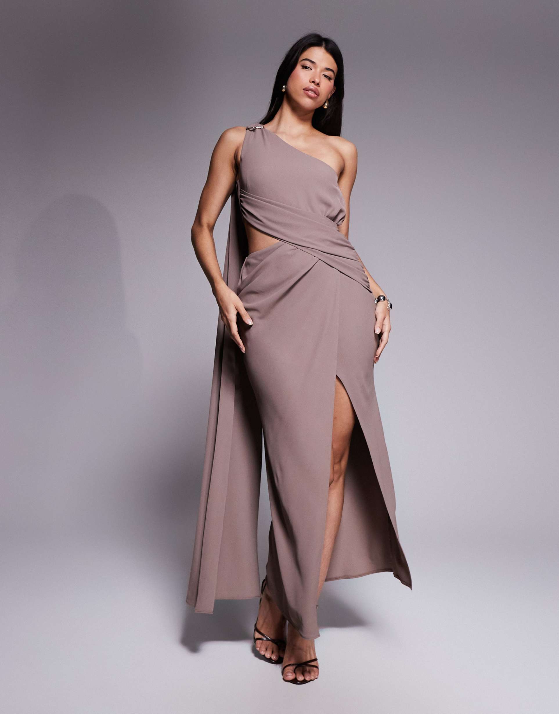 ASOS DESIGN ASYMMETRIC ONE SHOULDER CREPE MAXI DRESS WITH GOLD-TONE TRIM DETAIL IN MOCHA