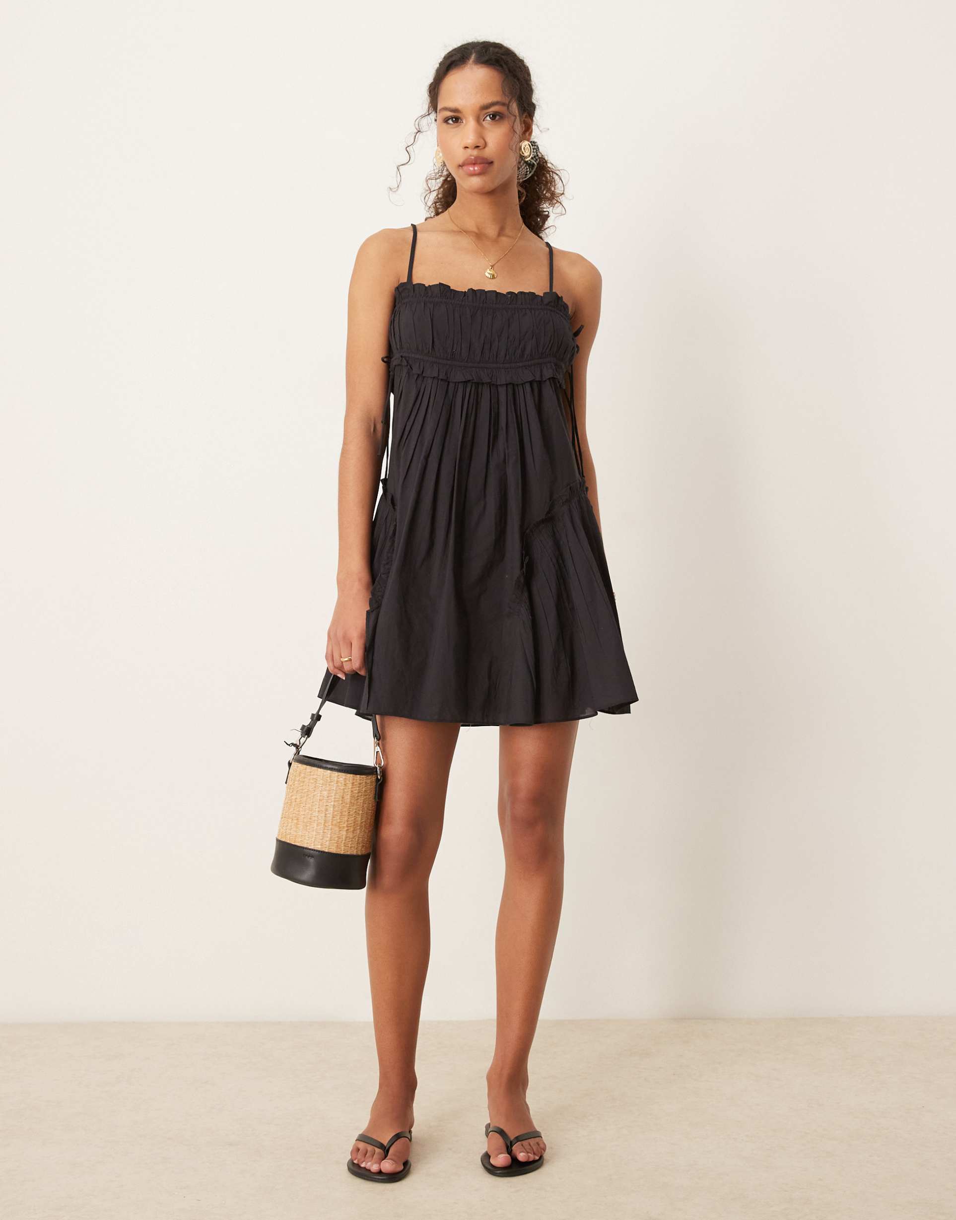 Soft cotton fabric and a flirty babydoll silhouette come together with adjustable spaghetti straps and a trendy square neckline. The mini length and regular fit create an easygoing feel, while the ruffled hem adds playful movement. Ideal for warm spring and summer days, this matte black dress suits casual outings, brunch dates, and relaxed evenings. The side tie-up closure enhances the adjustable fit, making it a versatile choice for everyday wear with a cute, casual chic vibe.