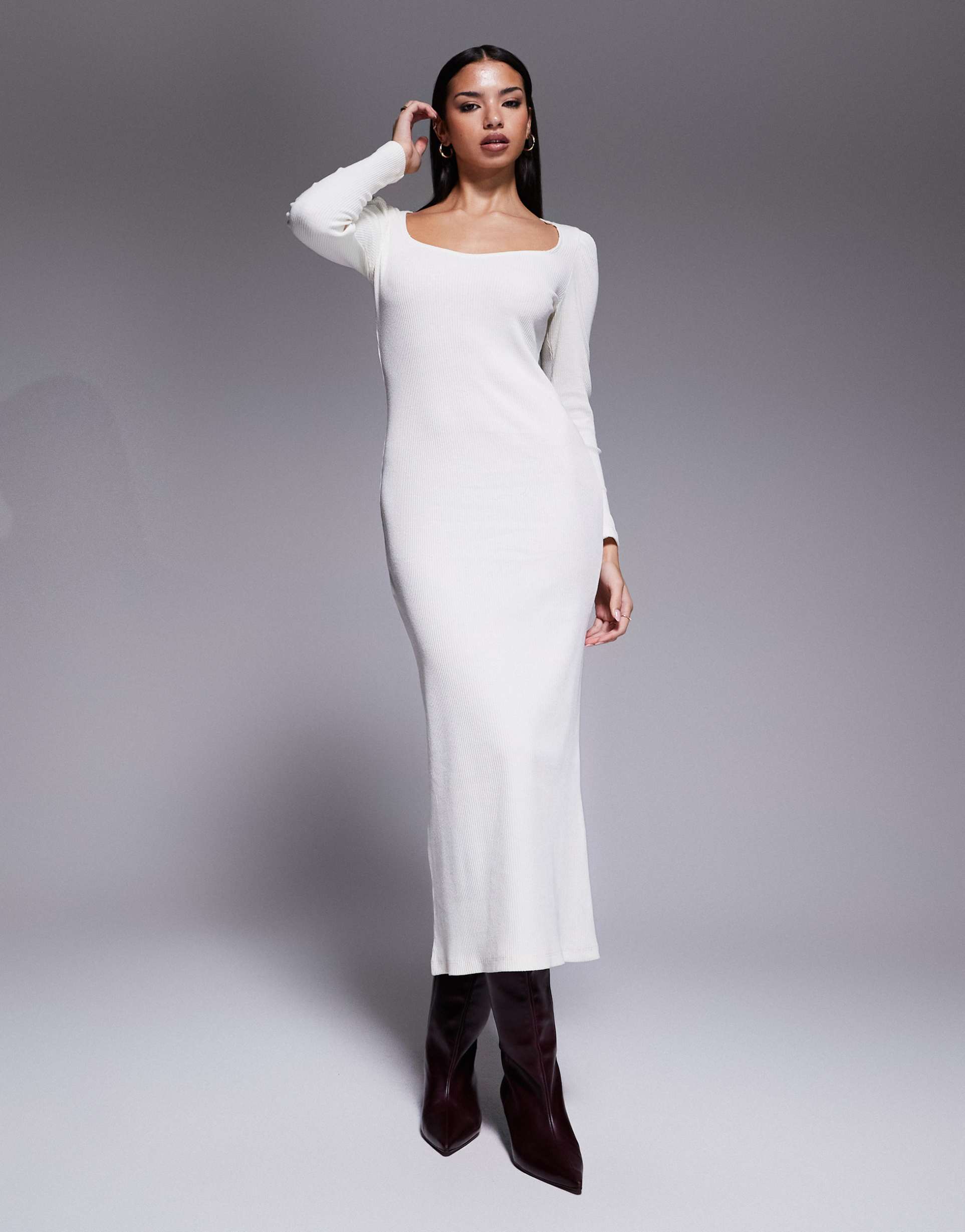 Soft ribbed knit fabric in a clean matte white shade frames a classic sheath silhouette with a flattering sweetheart neckline and elegant balloon long sleeves. The midi length and regular fit lend versatility, making this dress ideal for casual days, office wear, or romantic date nights. Its understated design and cozy knit composition offer comfort and warmth for autumn and winter seasons, while the clean hemline enhances its minimalist aesthetic.