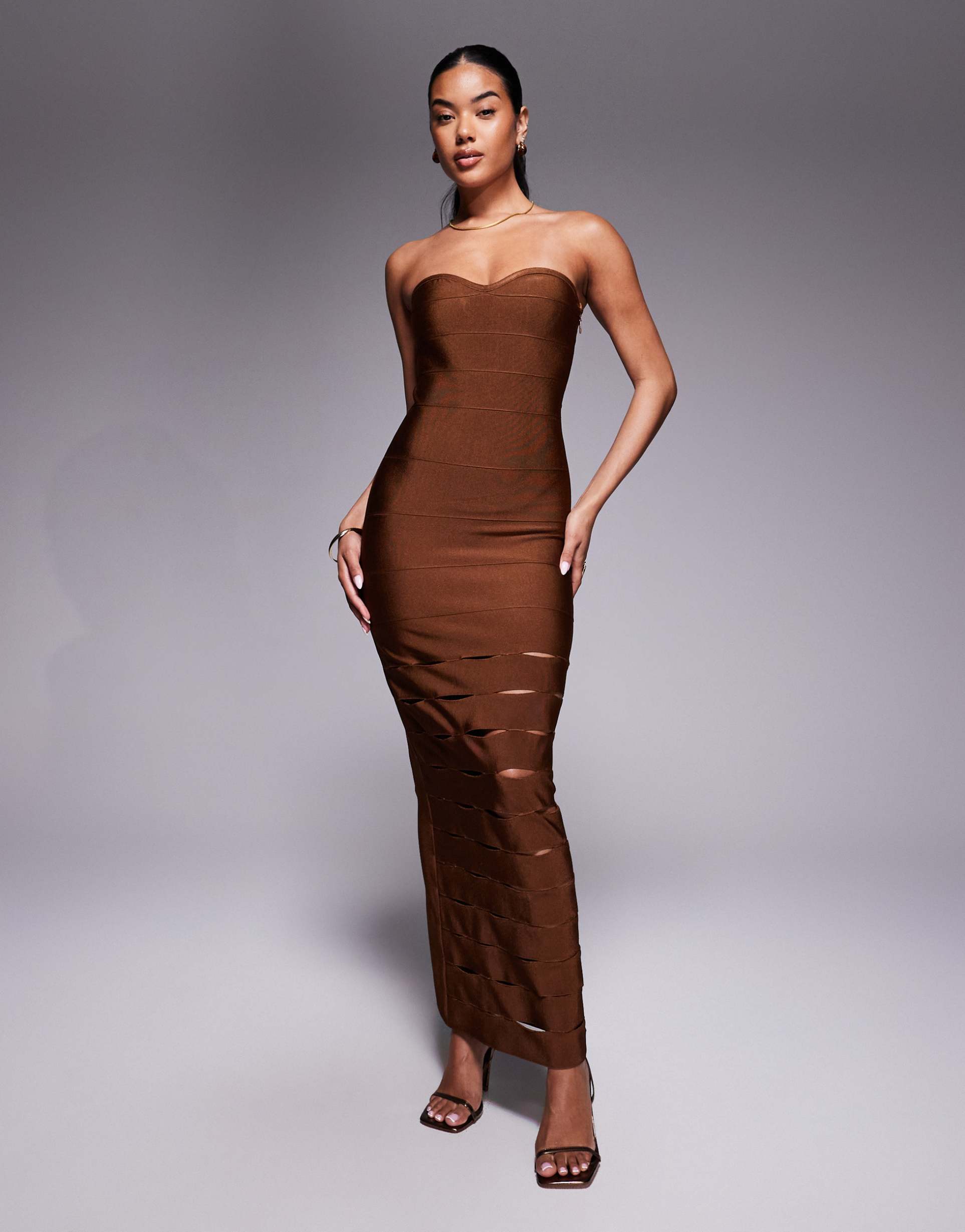 ASOS DESIGN BANDAGE BANDEAU MIDI DRESS WITH CUT-OUTS IN CHOCOLATE