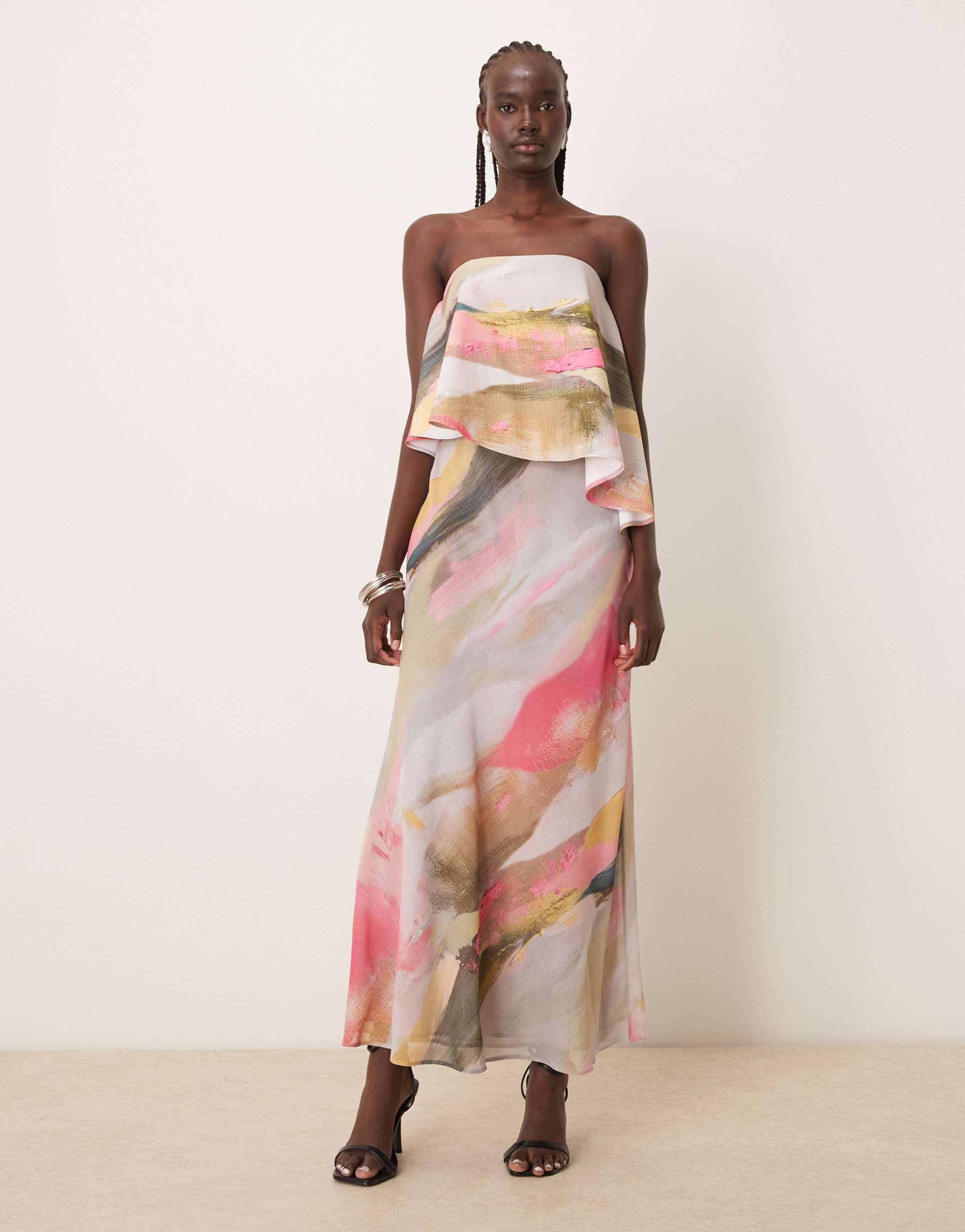 ASOS DESIGN BANDEAU ASYMMETRIC CONTRAST FABRIC BIAS CUT MAXI DRESS IN BRUSHSTROKE PRINT