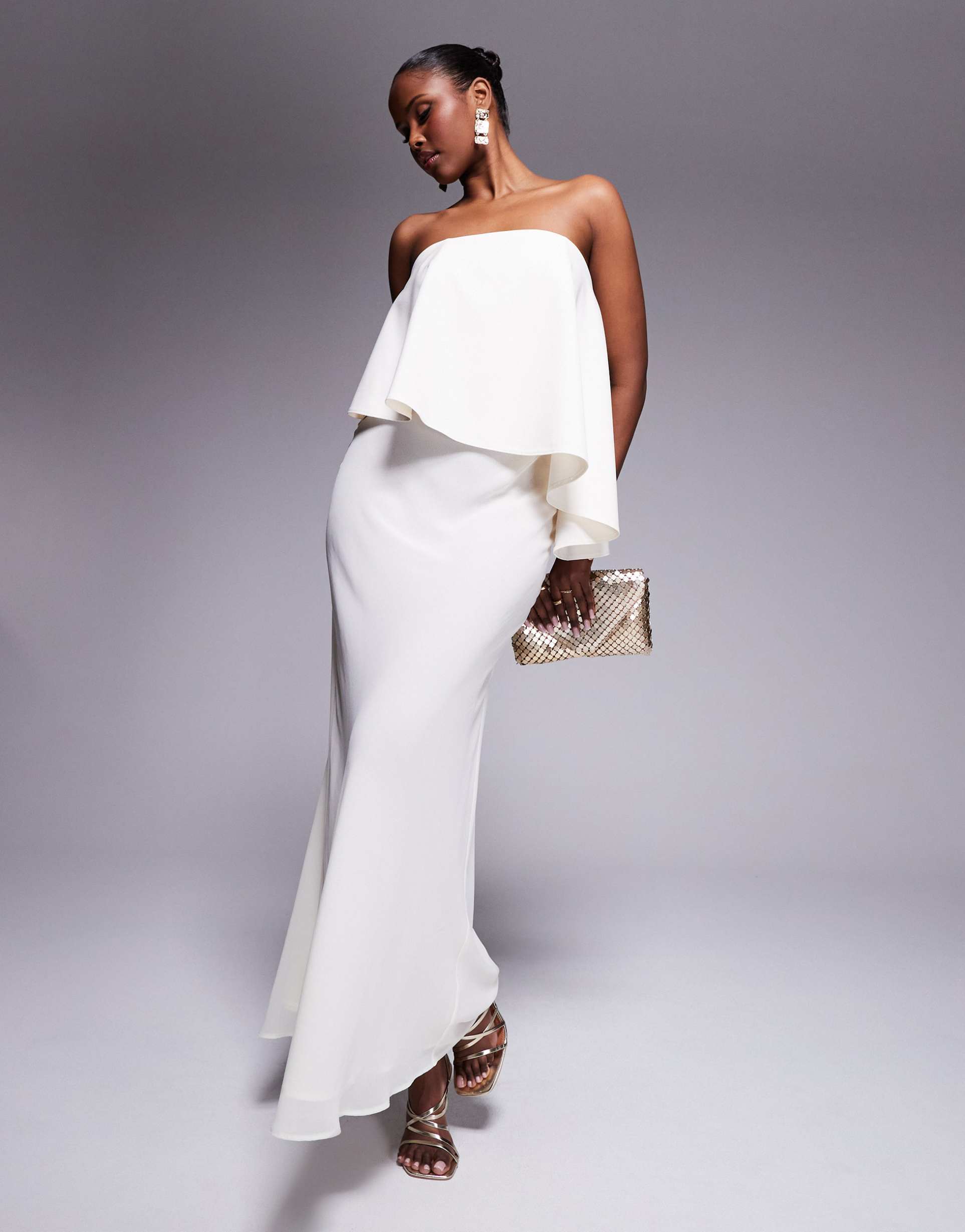 ASOS DESIGN BANDEAU ASYMMETRIC CONTRAST FABRIC BIAS MAXI DRESS IN IVORY