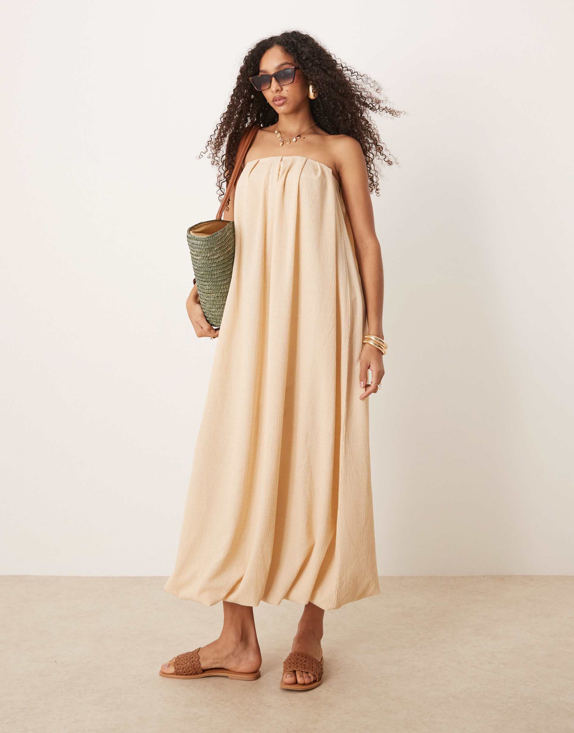 Soft polyester jersey with a subtle textured finish brings a relaxed feel to this strapless swing maxi dress. The regular fit and bubble hem create an easy silhouette that flows beautifully, perfect for warm spring and summer days. Featuring a bandeau neckline and sleeveless styling, it’s an ideal choice for casual outings, beach days, or vacation wear. The matte beige tone adds minimalist elegance while the ruffled bubble hem offers a playful design detail that elevates this understated piece for everyday and casual chic looks.