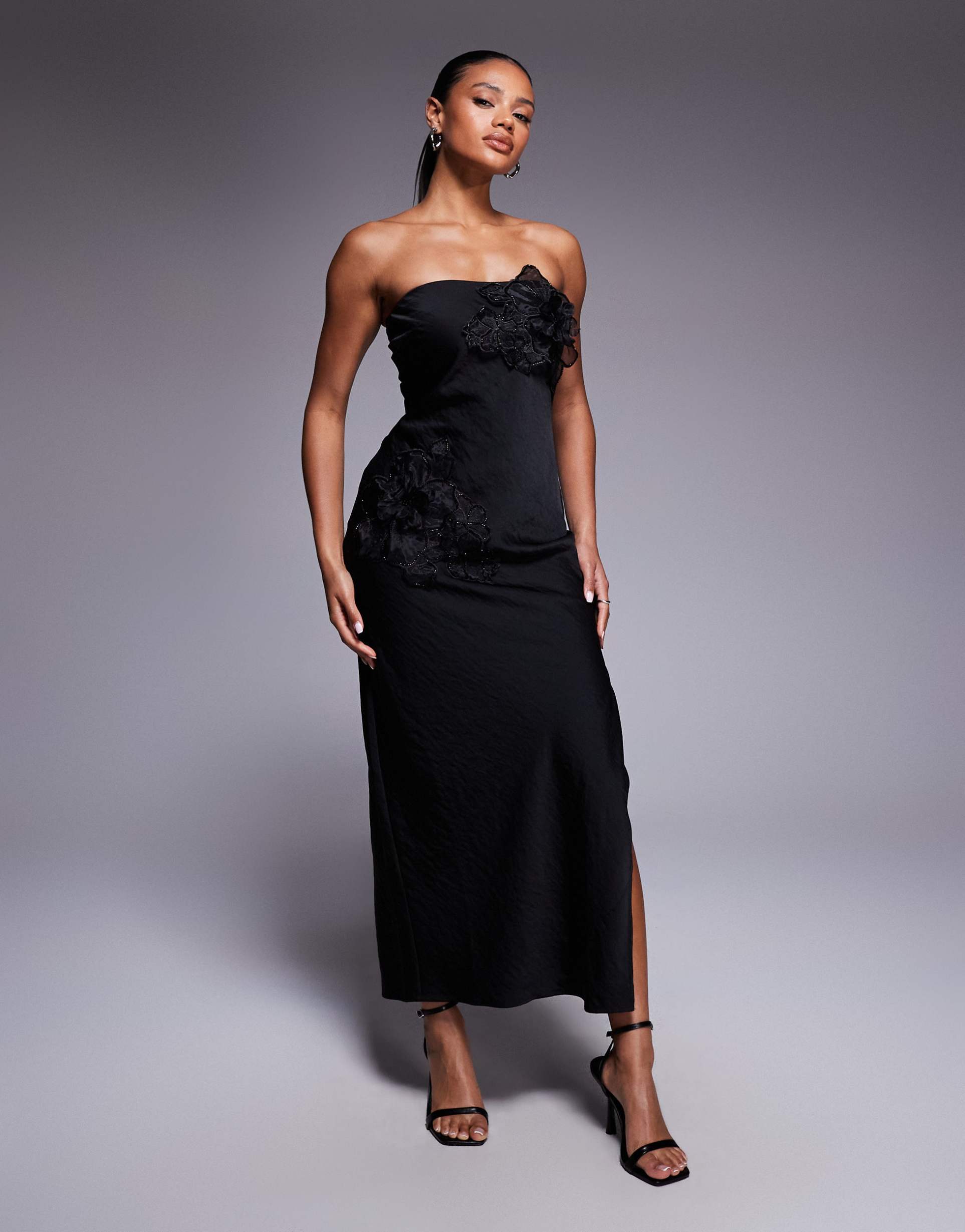 ASOS DESIGN BANDEAU FLOWER APPLIQUE MAXI DRESS IN BLACK