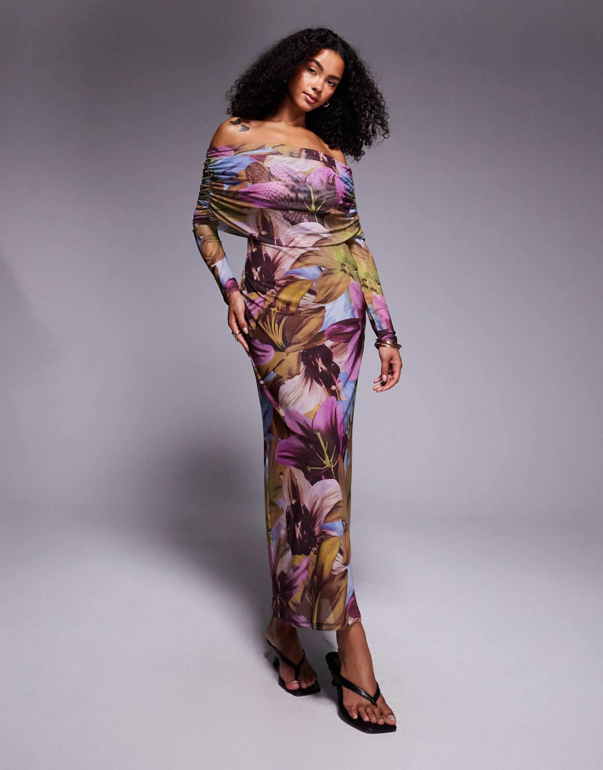 Soft jersey fabric with a stretchy feel sculpts a slim silhouette in this midi dress featuring a flattering off-shoulder bardot neckline and long sleeves. The all-over dark floral print in muted purples, browns, and greens adds an elegant yet modern touch, while the front draping and fold-over detail create subtle texture. The slit hemline enhances movement and style, making it a versatile piece for brunch, date nights, or cocktail events in spring and autumn seasons.